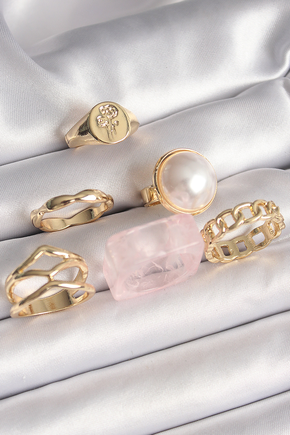 Tegan Pirinç Gold Renk Daire 3D İncili Figür Zincir Model Gül İşleme Detaylı 6’Lı Kadın Yüzük Seti TG27BYK3625
