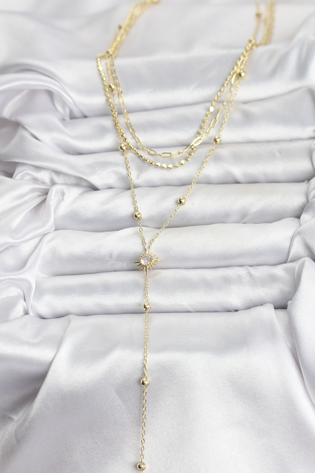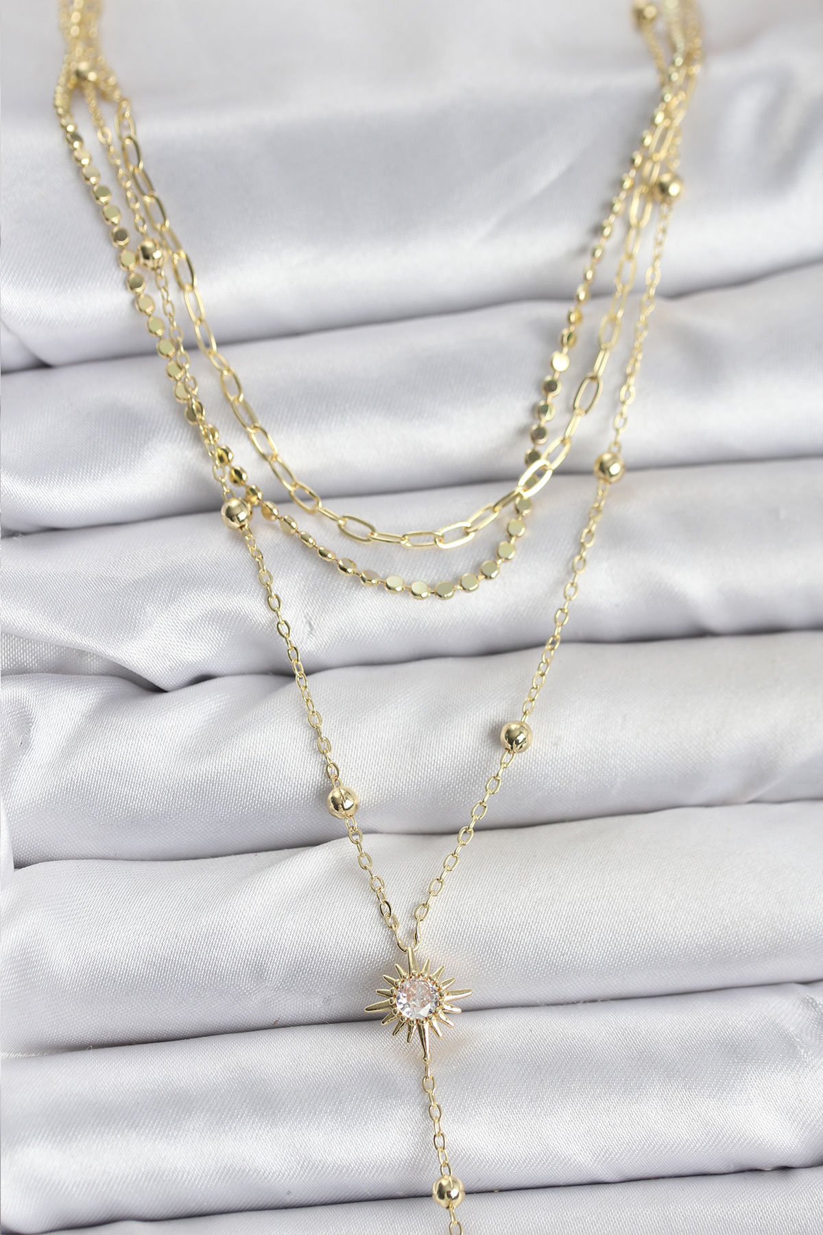 Tegan Pirinç Gold Renk Güneş Model Detaylı 3’lü Kombin Y Kadın Kolye TG27BKO10692