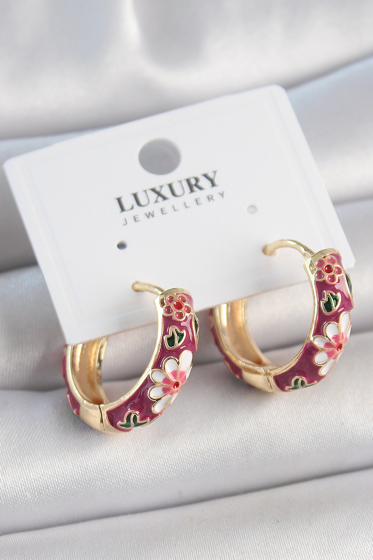 Tegan Pirinç Gold Renk Halka Mor Çiçek Mineli Kadın Küpe TG27BKP10474