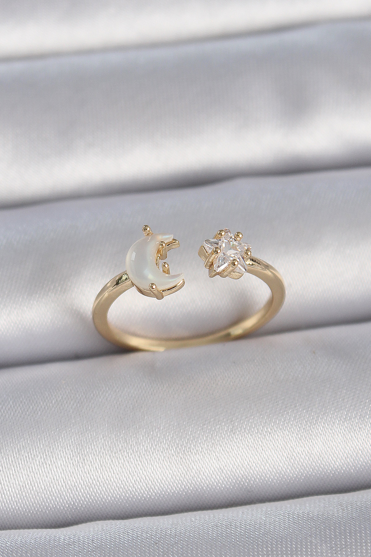 Tegan Pirinç Gold Renk İncili Hilal Zirkon Taşlı Yıldız Ayarlanabilir Model Kadın Yüzük TG27BYK3360