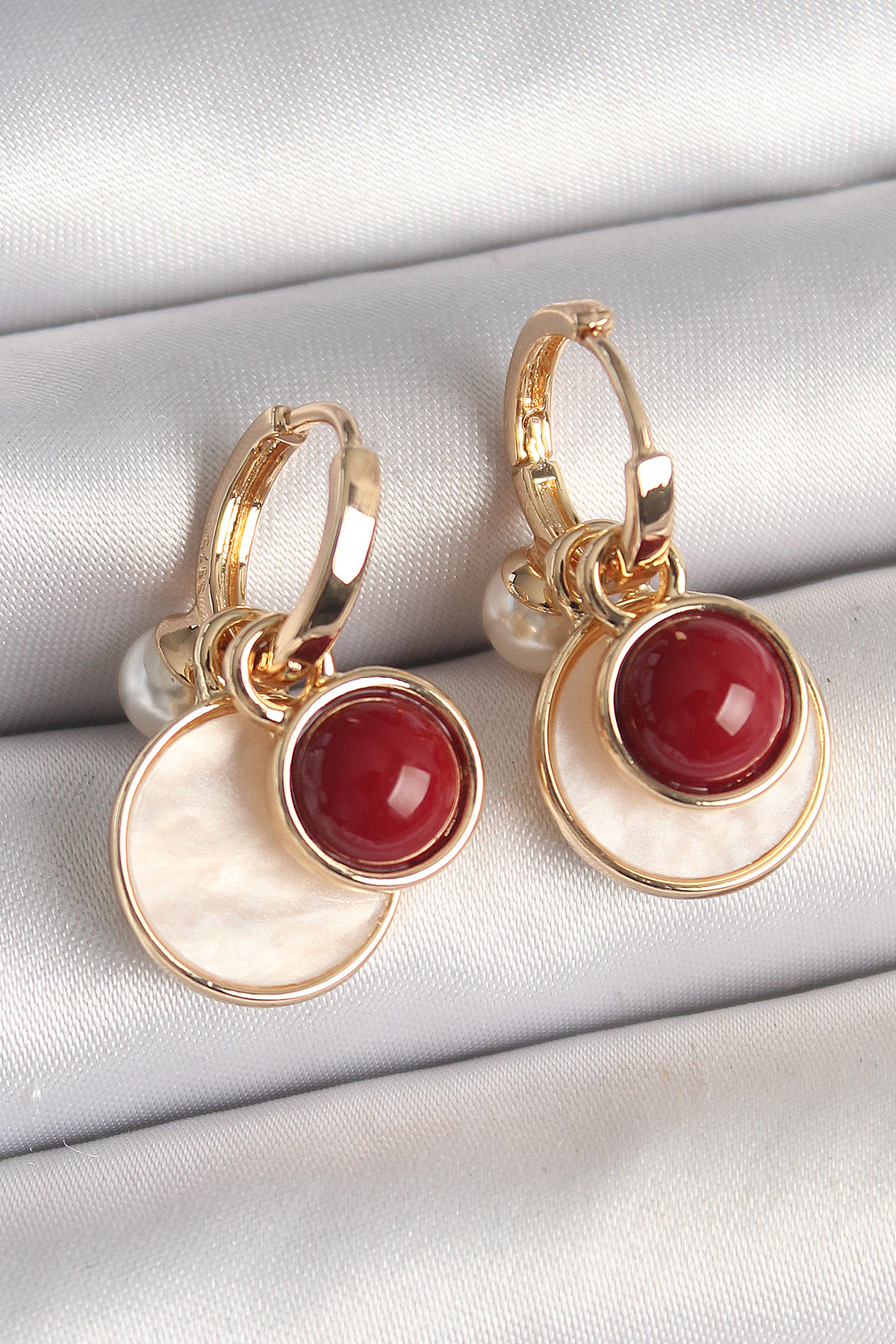 Tegan Pirinç Gold Renk Sallantı Beyaz Mineli Bordo Detay Kadın Küpe TG27BKP10362