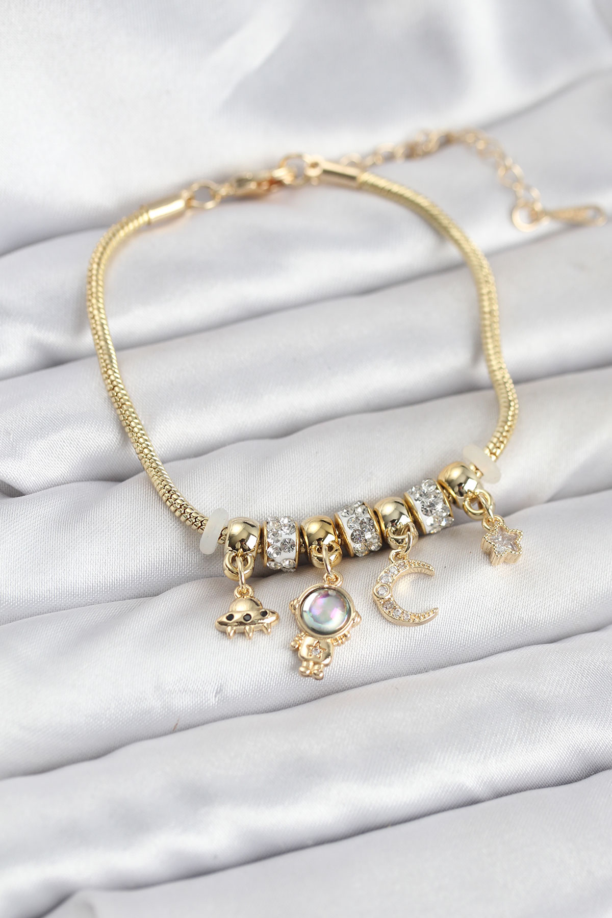 Tegan Pirinç Gold Renk Uzay Tema Charmlı Kadın Bileklik TG27BB8179