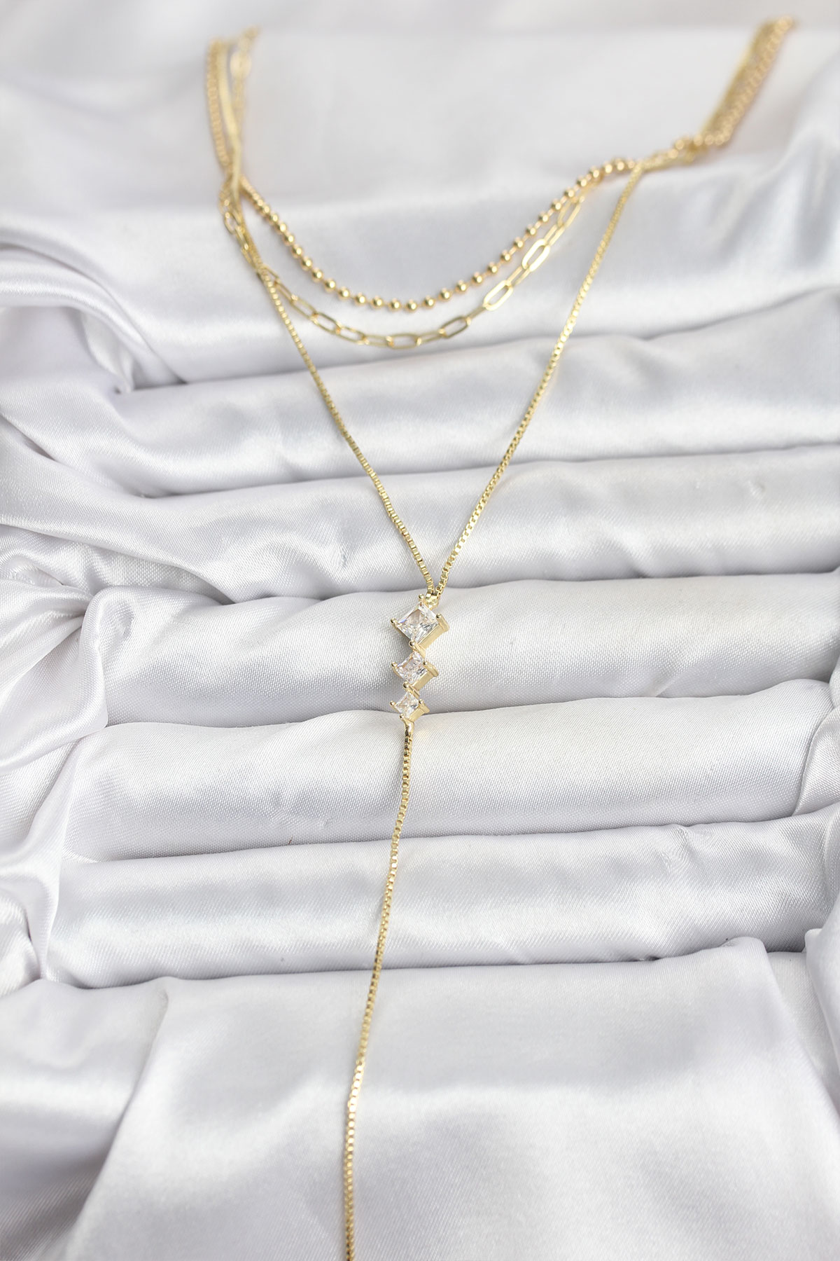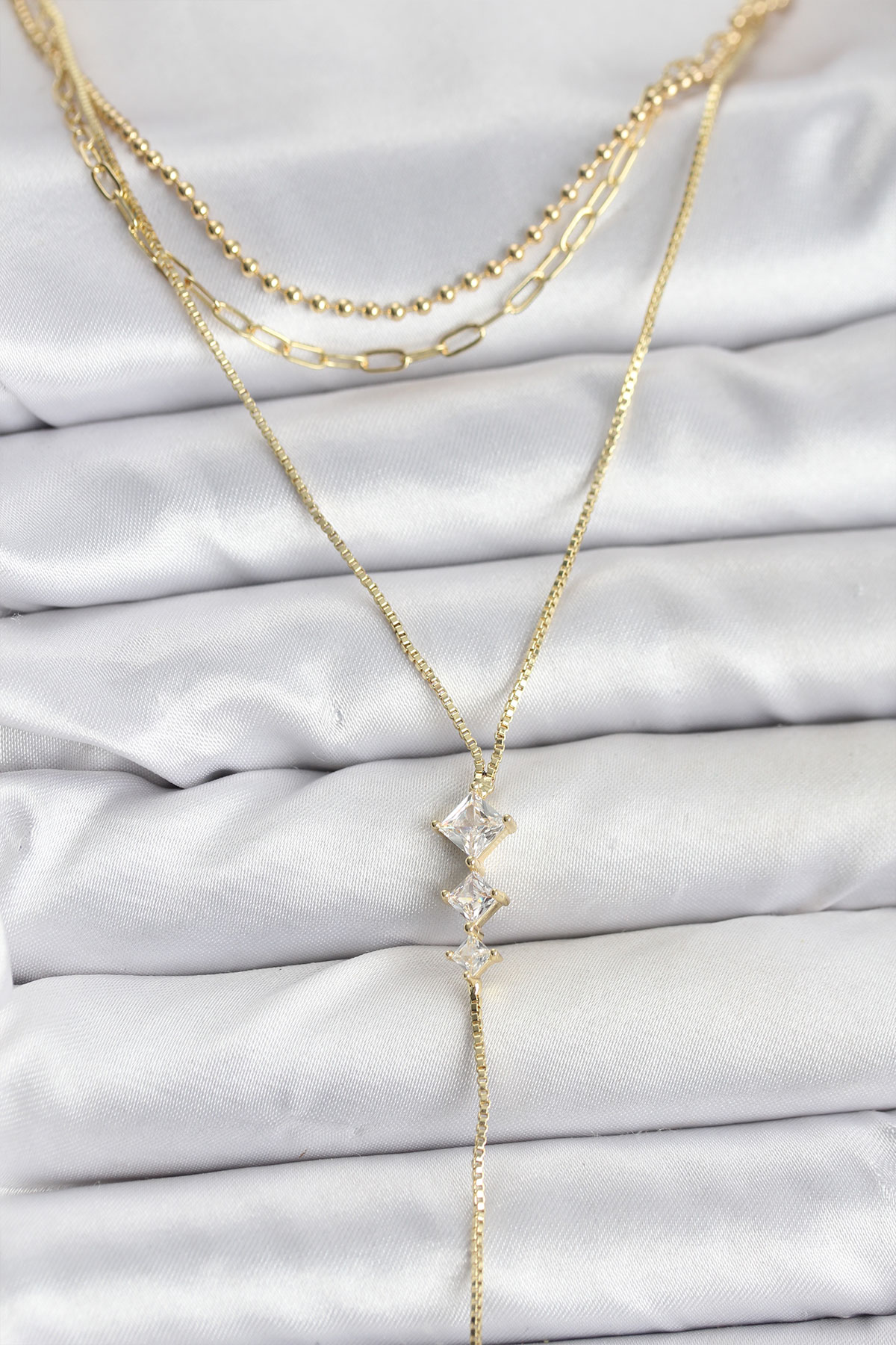 Tegan Pirinç Gold Renk Zirkon Taş Detaylı 3’lü Kombin Y Kadın Kolye TG27BKO10691