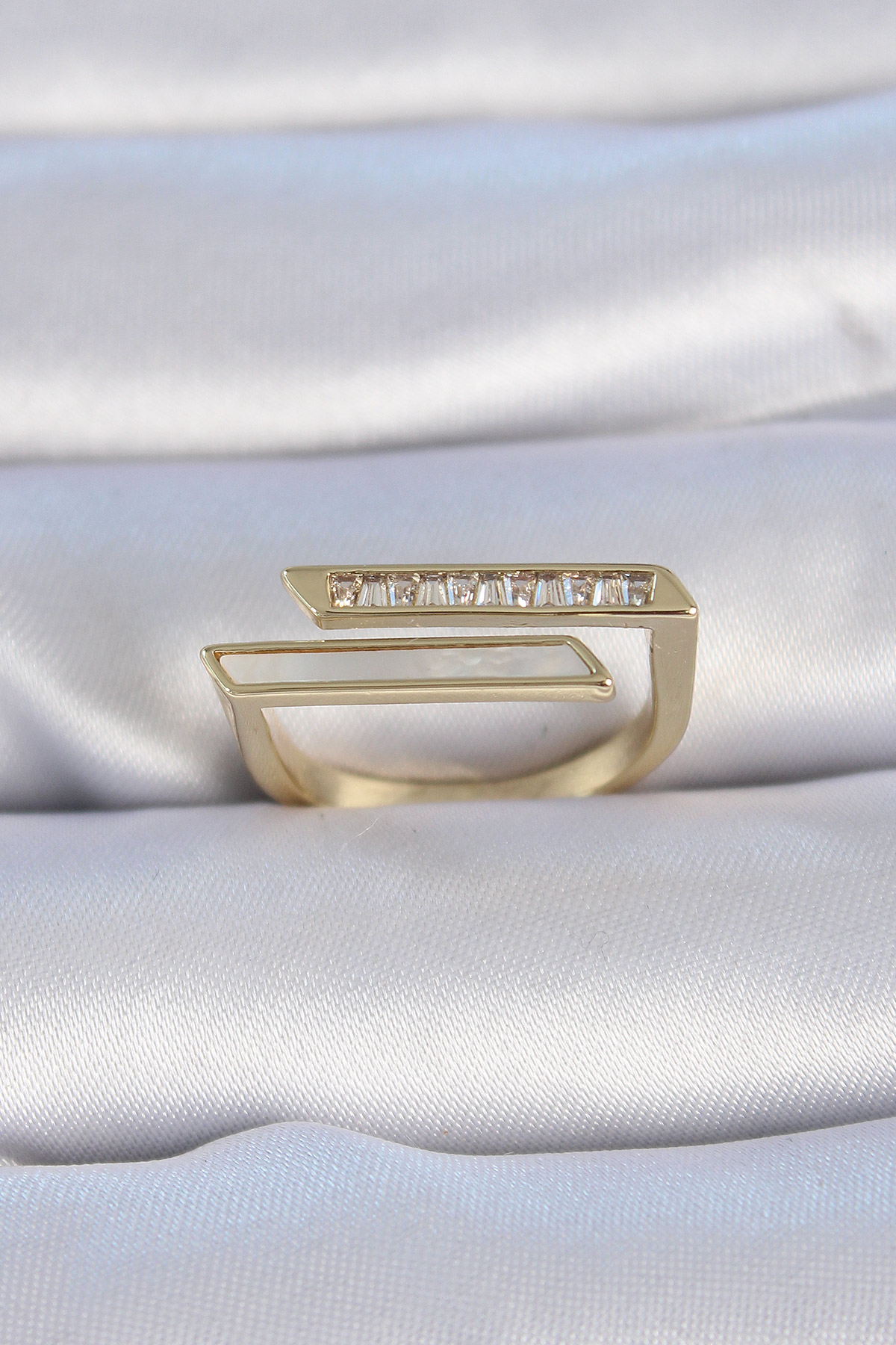Tegan Pirinç Gold Renk Zirkon Taşlı Beyaz Sedef Detay Kadın Yüzük TG27BYK3348
