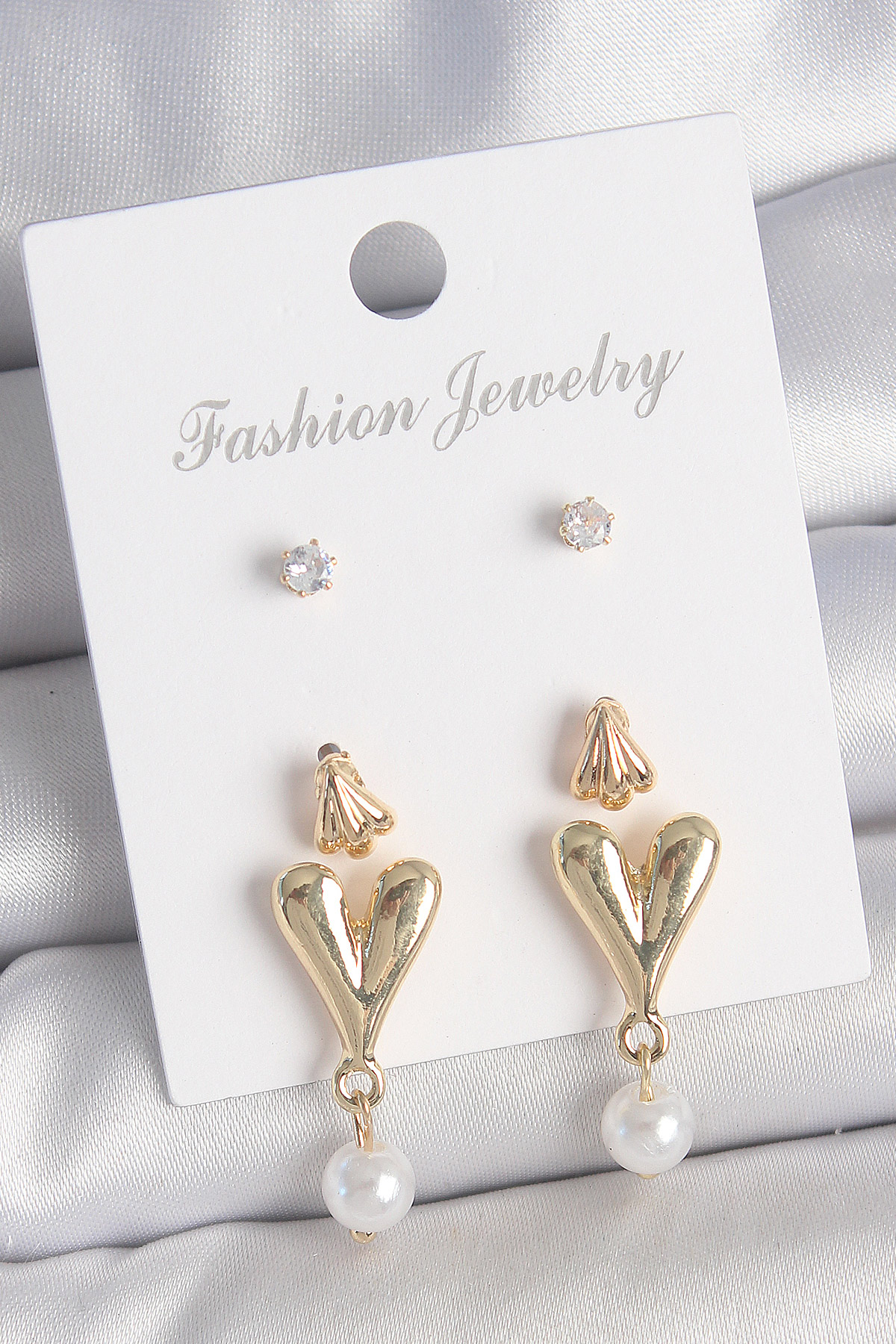 Tegan Pirinç Gold Renk Zirkon Taşlı İncili Sallantılı Kalp Model 3 Çift Kadın Küpe Seti TG27BKP10608
