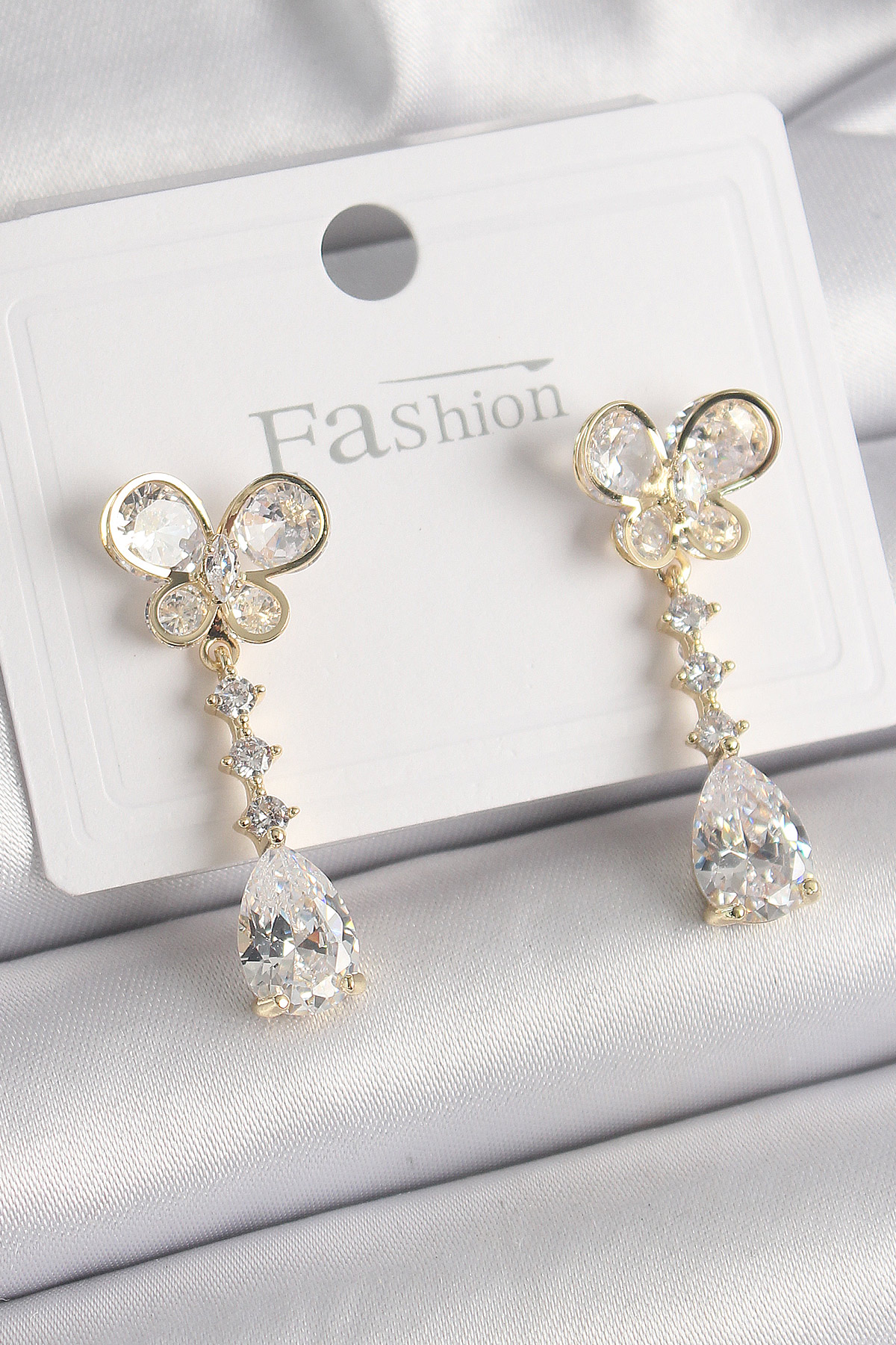Tegan Pirinç Gold Renk Zirkon Taşlı Kelebek Model Sallantı Damla Zirkon Taş Kadın Küpe TG27BKP9860