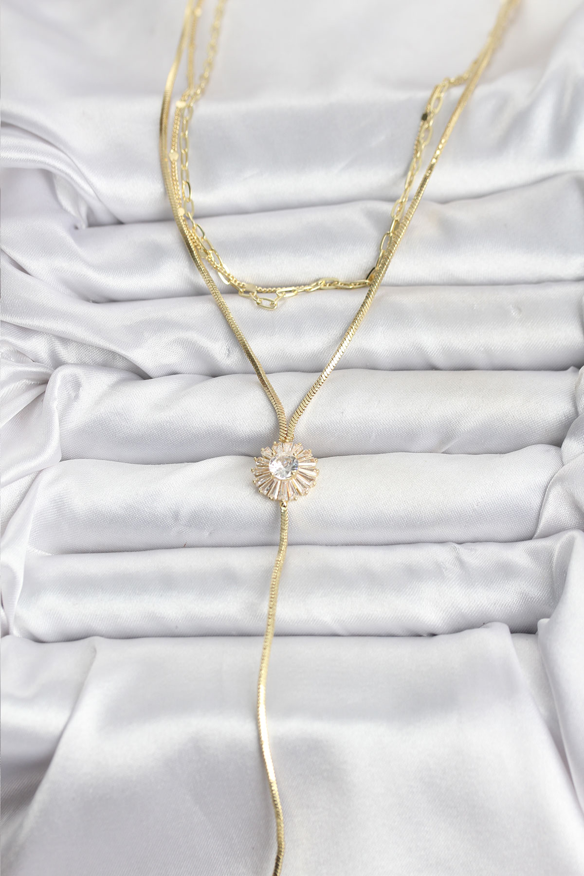 Tegan Pirinç Gold Renk Zirkon Taşlı Papatya Model Detaylı 3’lü Kombin Y Kadın Kolye TG27BKO10696