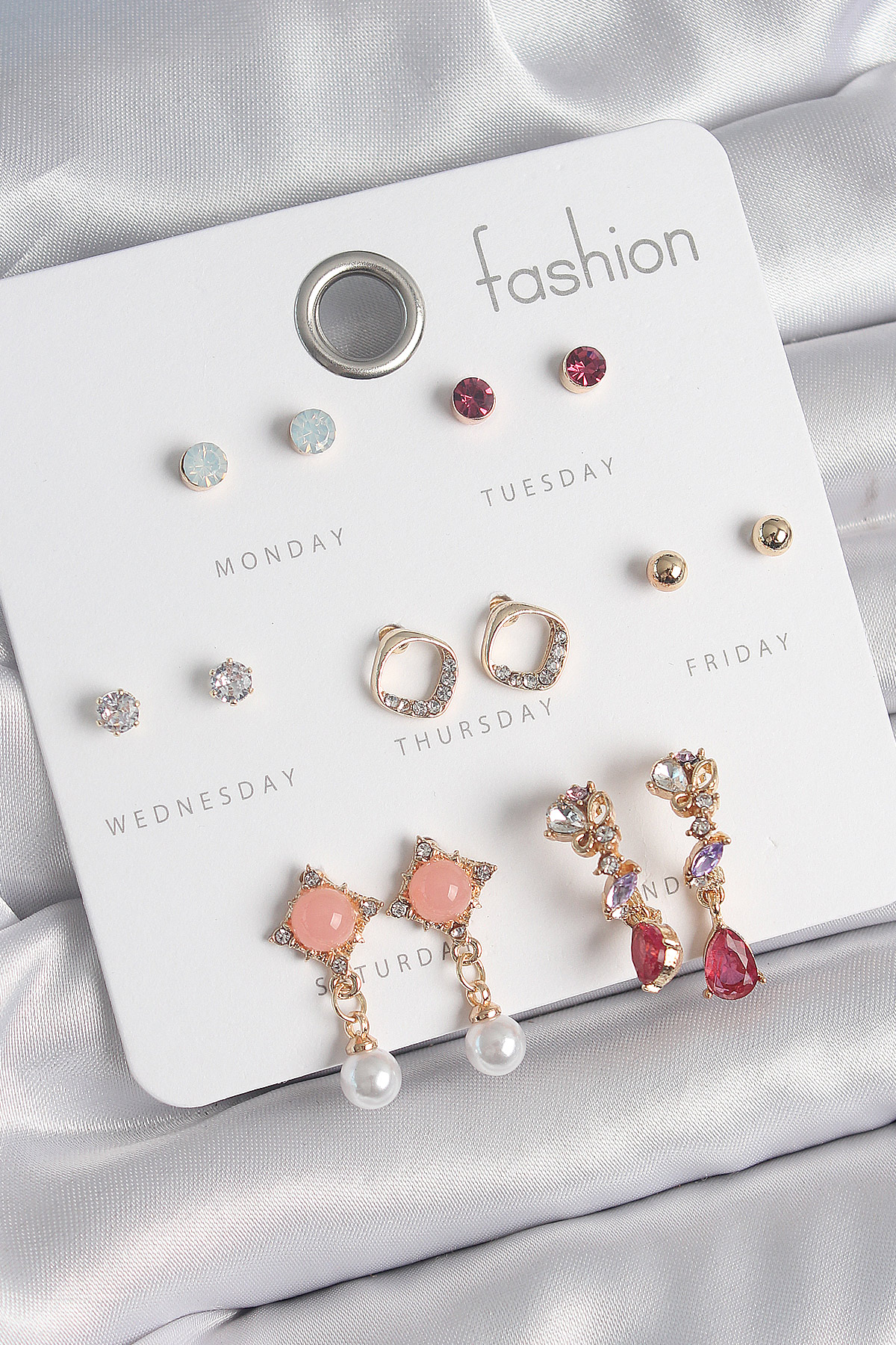 Tegan Pirinç Gold Renk Zirkon Taşlı Sallantı İnci Detay 7 Çift Kadın Küpe TG27BKP10534