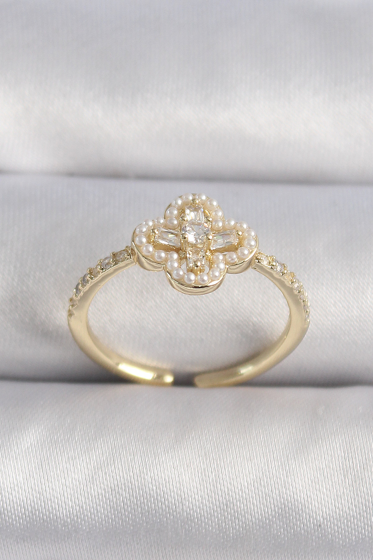 Tegan Pirinç Gold Renk Zirkon Taşlı Yonca Model İnci Detay Kadın Yüzük TG27BYK3494