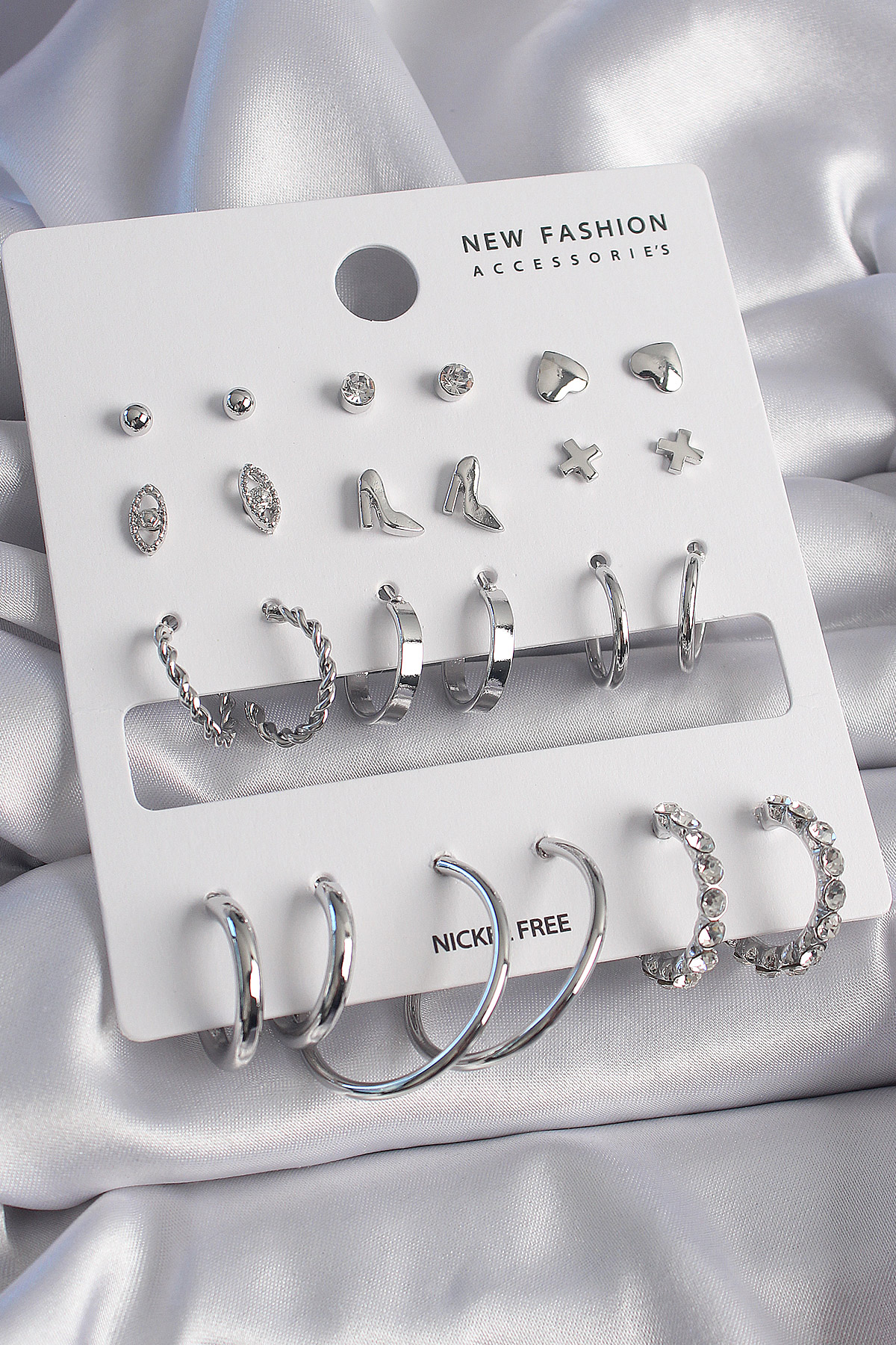 Tegan Pirinç Gümüş Renk 12 Çift Kadın Küpe Seti TG27BKP9683