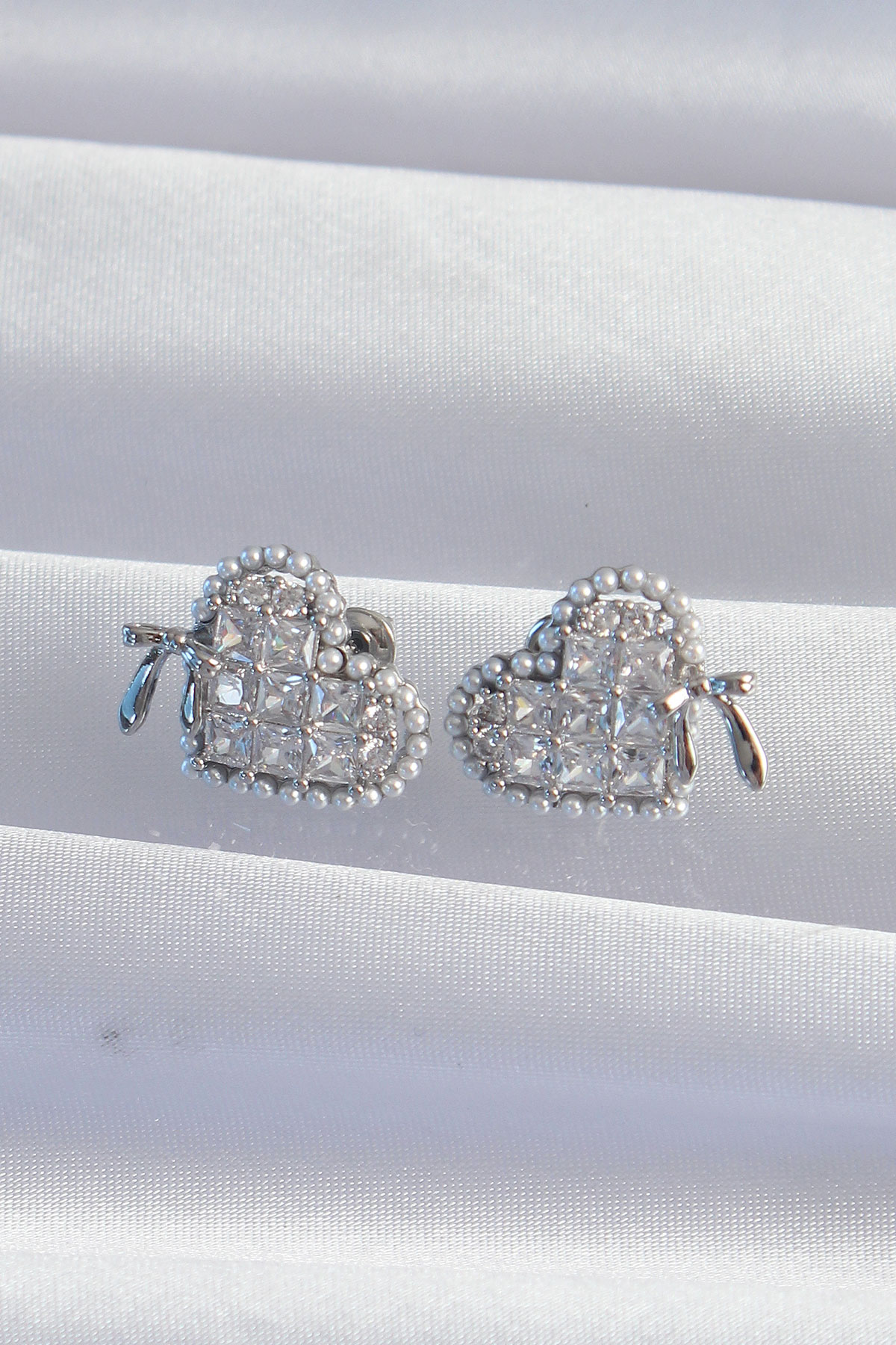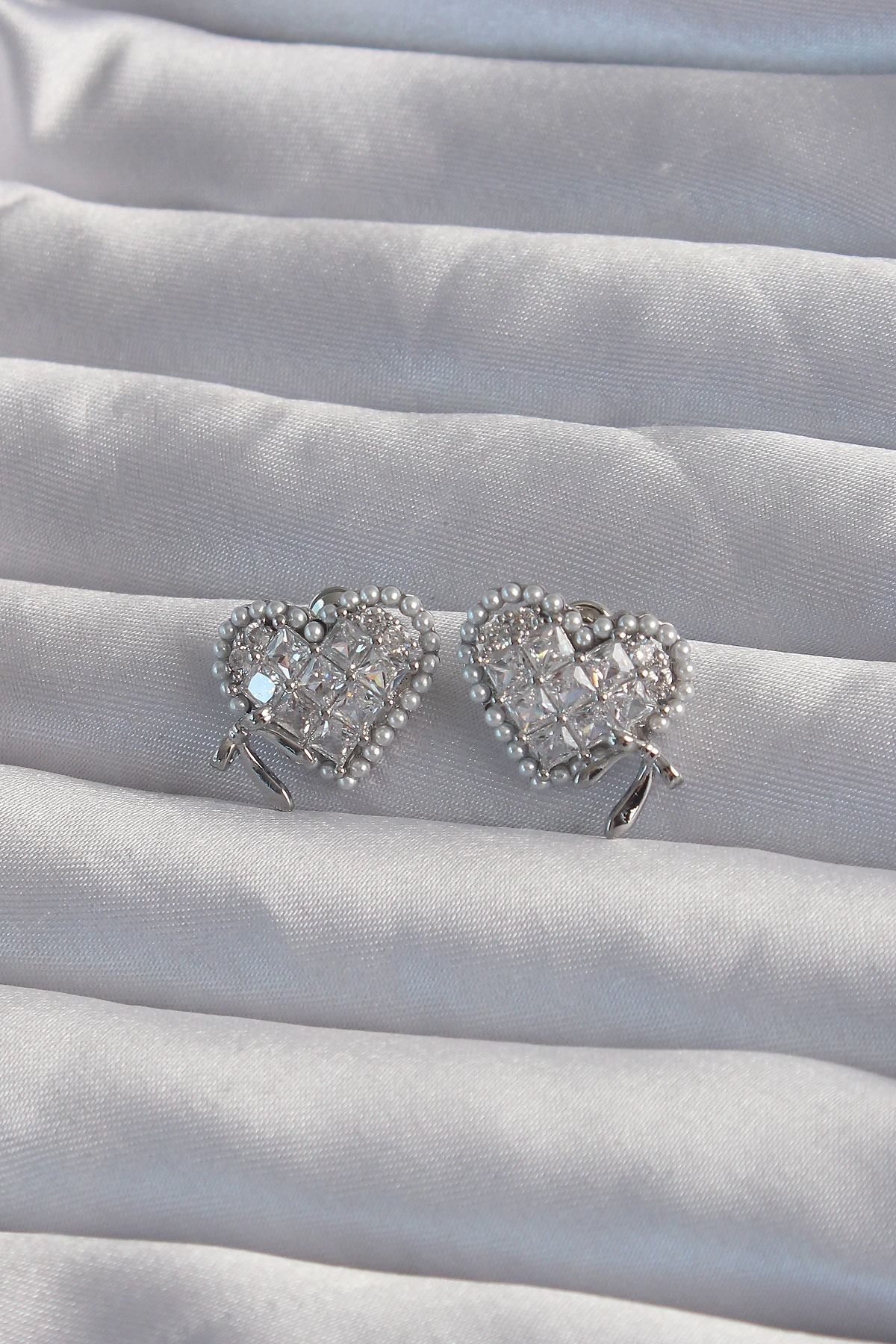 Tegan Pirinç Gümüş Renk Fiyonk Detay İncili Zirkon Taşlı Kalp Küpe TG27BKP9298