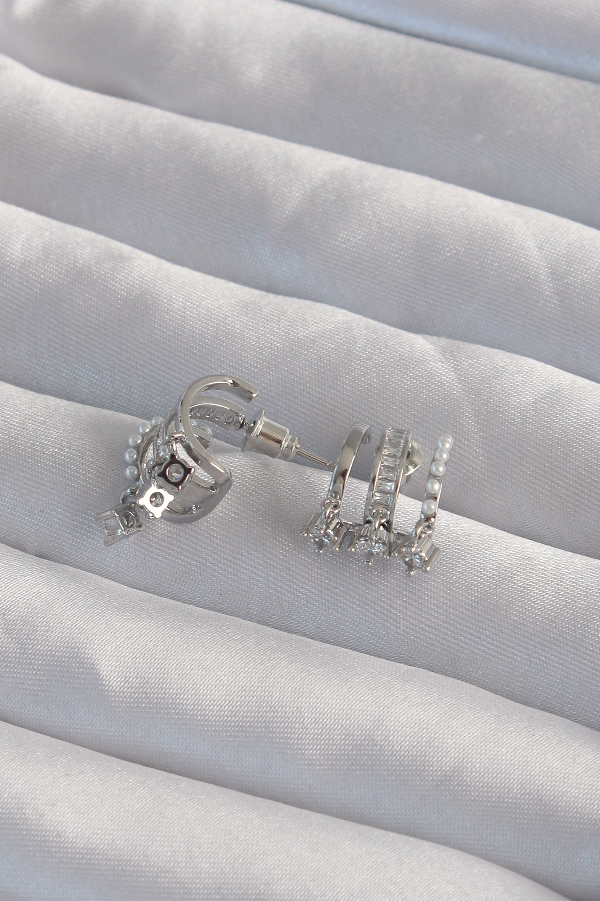 Tegan Pirinç Gümüş Renk İncili Çoklu Zirkon Taşlı Yarım Halka Küpe TG27BKP9316