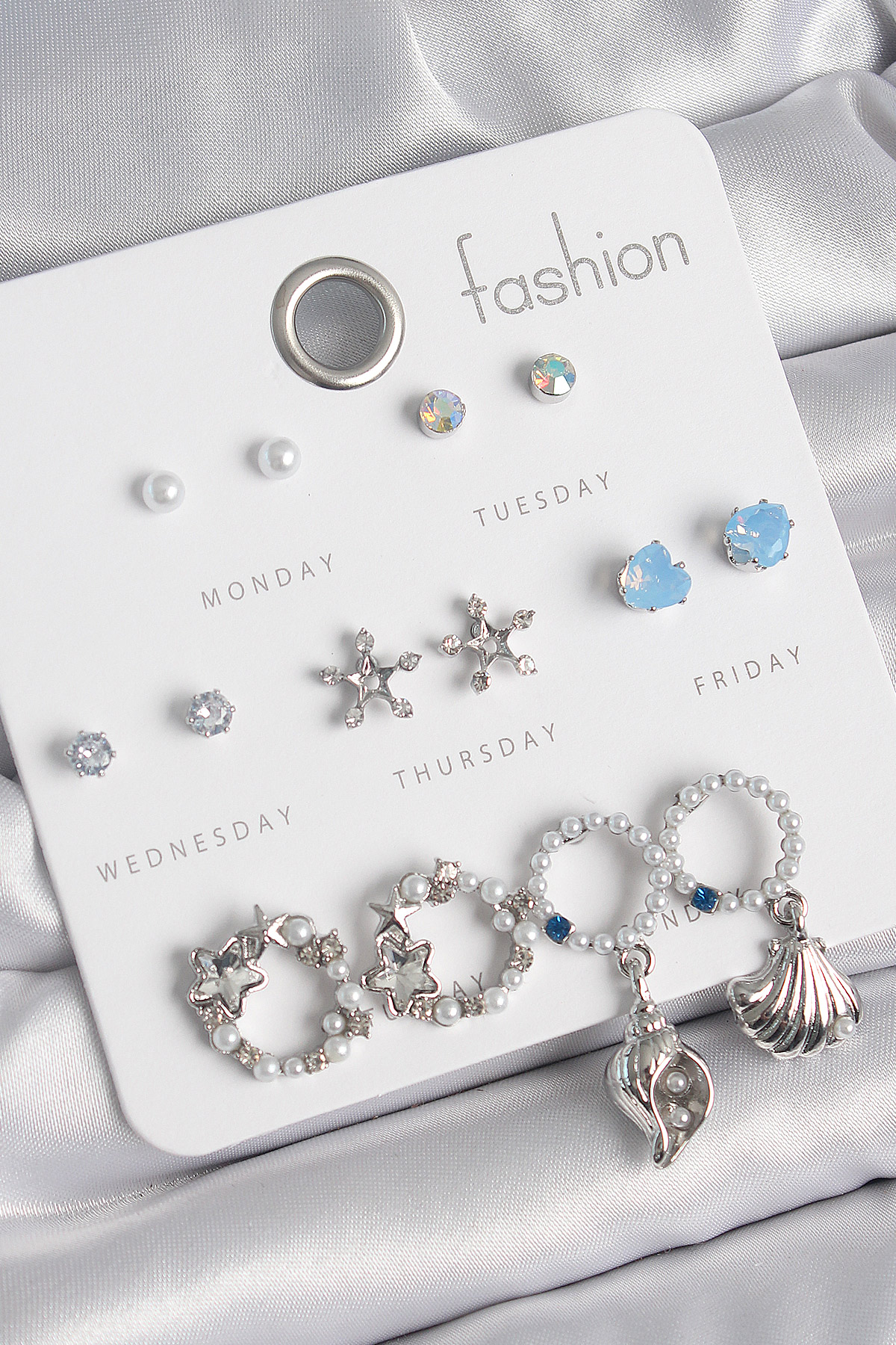 Tegan Pirinç Gümüş Renk İncli Zirkon Taşlı Halka Figür Yıldız Detay 7 Çift Kadın Küpe Seti TG27BKP10547
