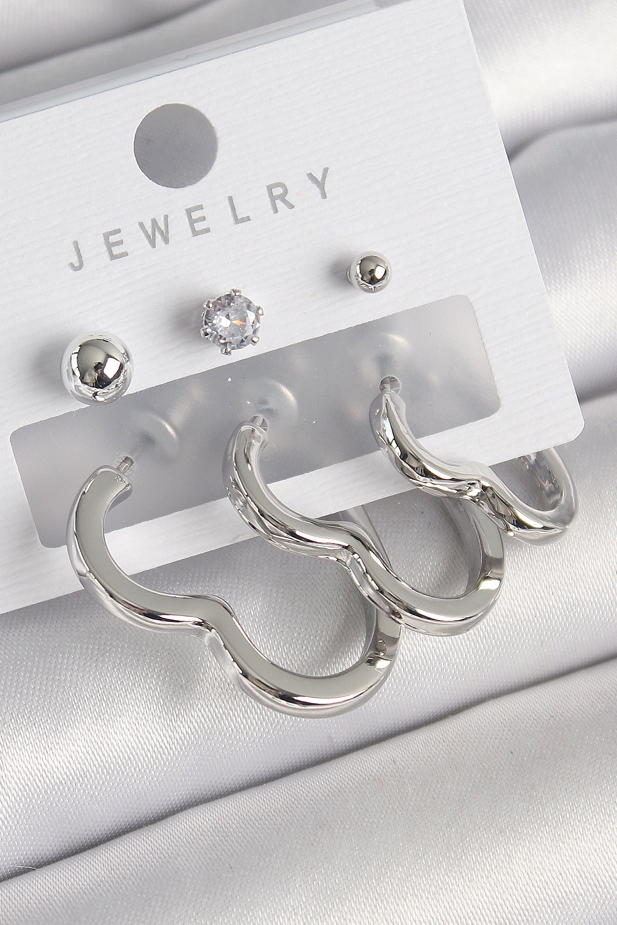 Tegan Pirinç Gümüş Renk Kalp Model Zirkon Taş Topçuk Detay Kadın Küpe Seti TG27BKP10307