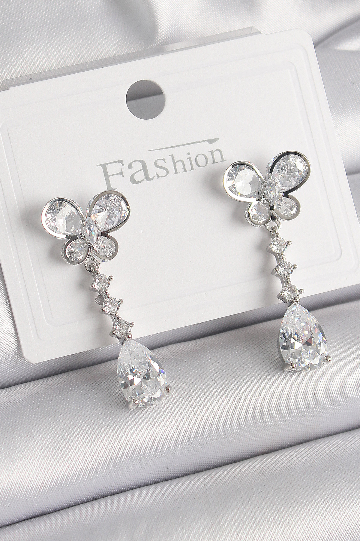 Tegan Pirinç Gümüş Renk Kelebek Model Sallantı Damla Zirkon Taşlı Kadın Küpe TG27BKP9861
