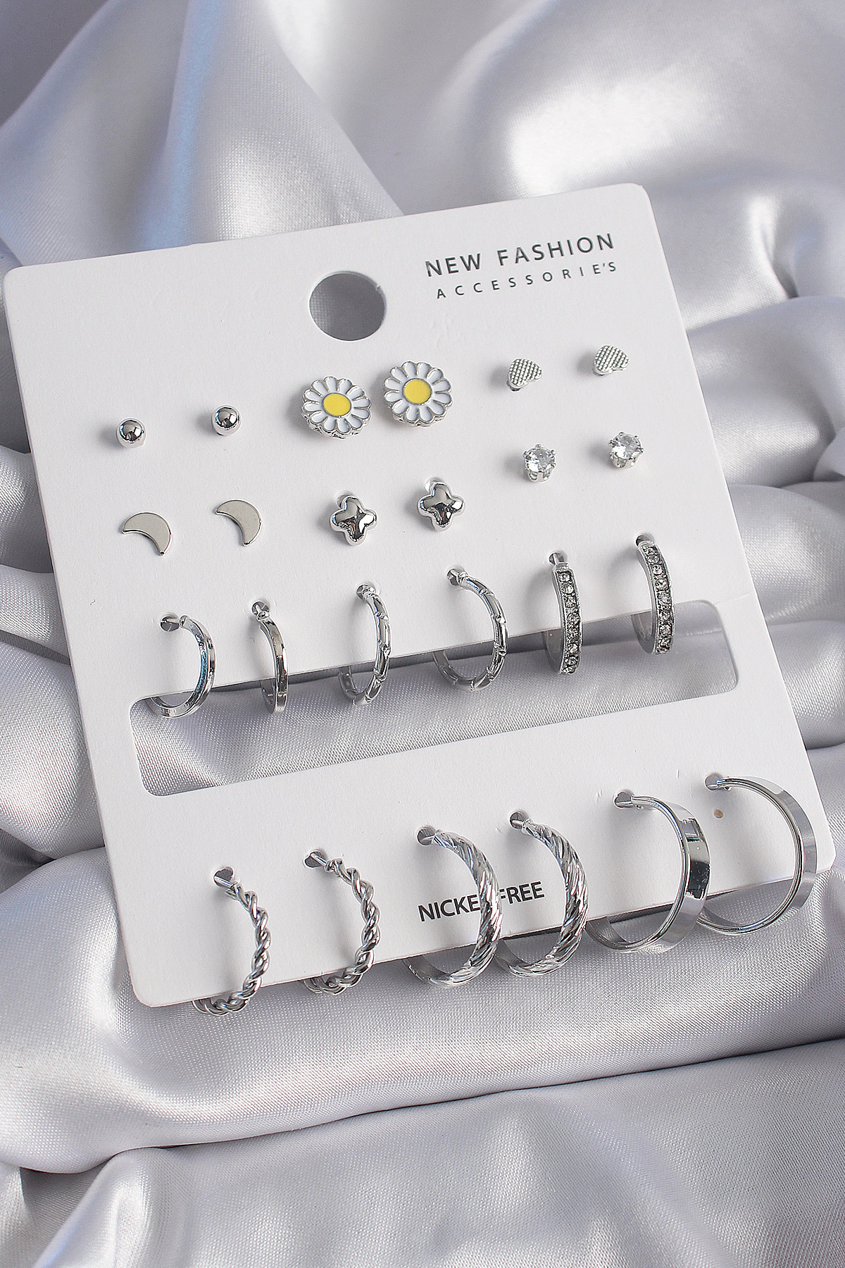 Tegan Pirinç Gümüş Renk Papatya Detaylı 12 Çiftli Kadın Küpe Seti TG27BKP9686