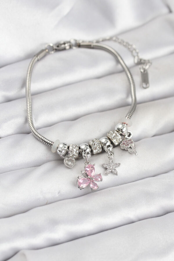 Tegan Pirinç Gümüş Renk Pembe Kelebek Charmlı Kadın Bileklik TG27BB8204