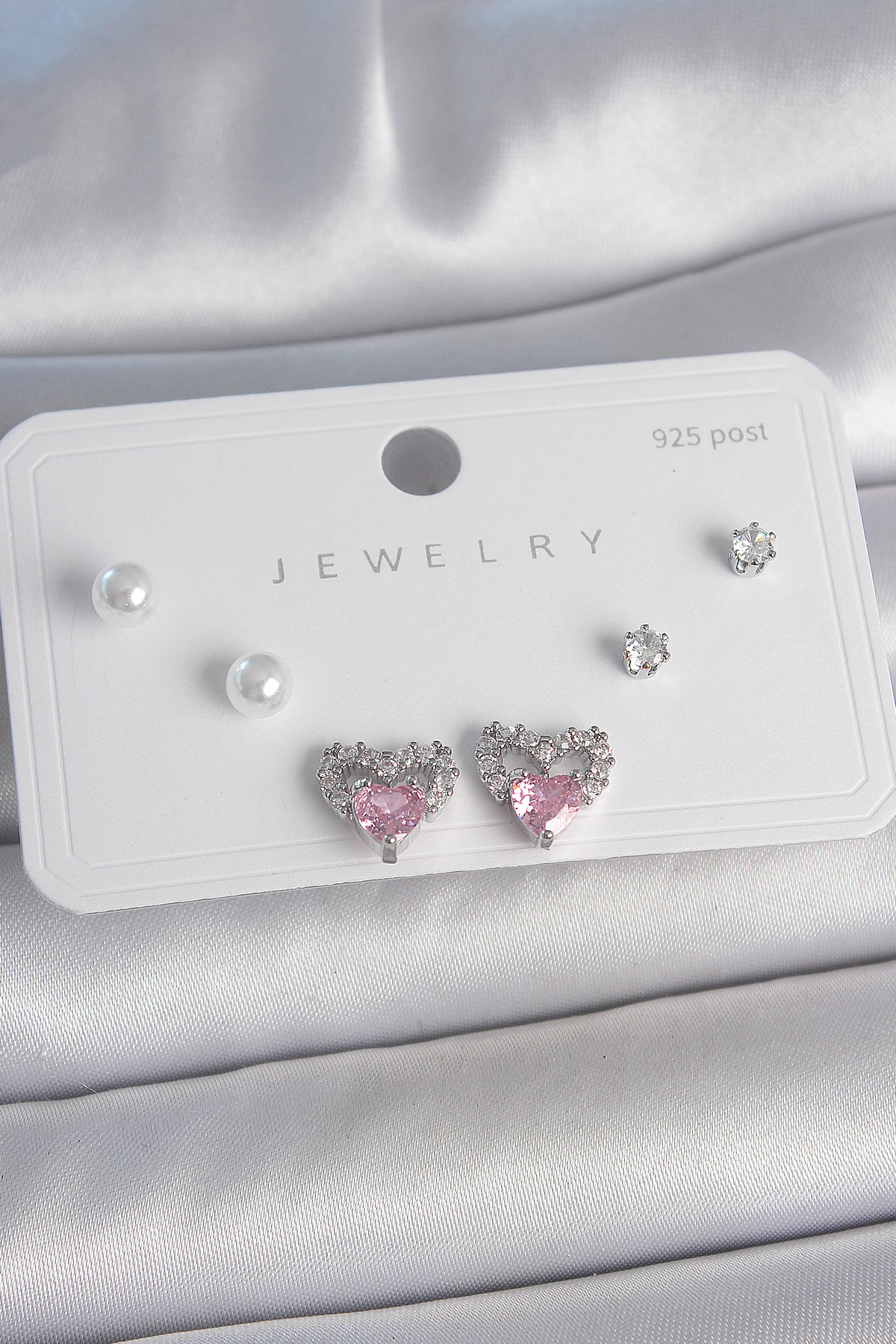 Tegan Pirinç Gümüş Renk Pembe Zirkon Taşlı Kalp Model İnci Detay 925 Ayar Gümüş Çivi Kadın Küpe Seti TG27BKP10489
