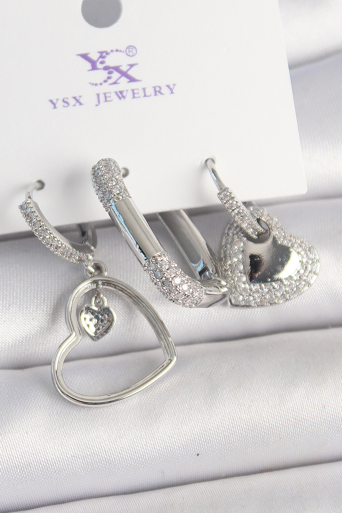 Tegan Pirinç Gümüş Renk Sallantı Zirkon Taşlı Kalp Model 3’Lü Kadın Kombin Küpe TG27BKP10442