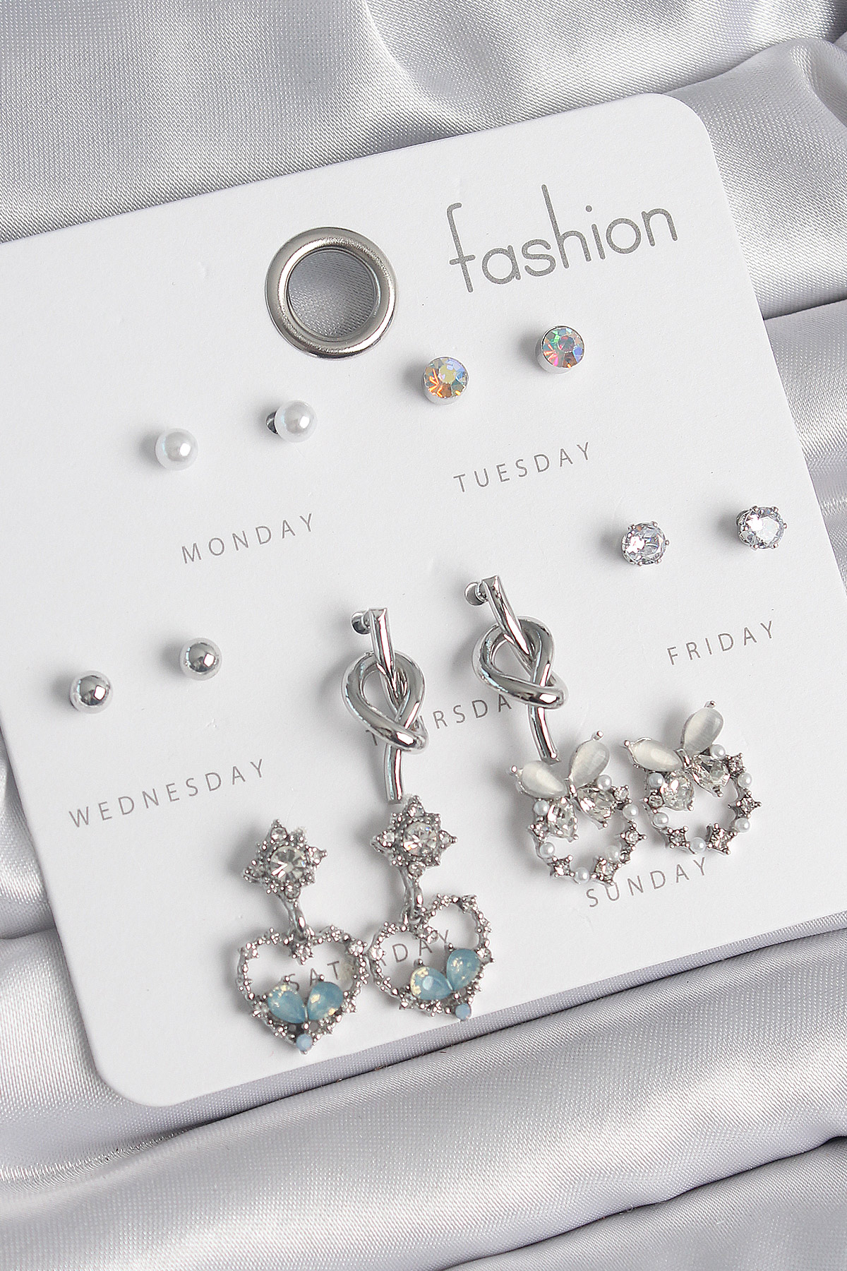 Tegan Pirinç Gümüş Renk Sallantı Zirkon Taşlı Kalp Model Düğüm Detay 7 Çift Kadın Küpe Seti TG27BKP10548
