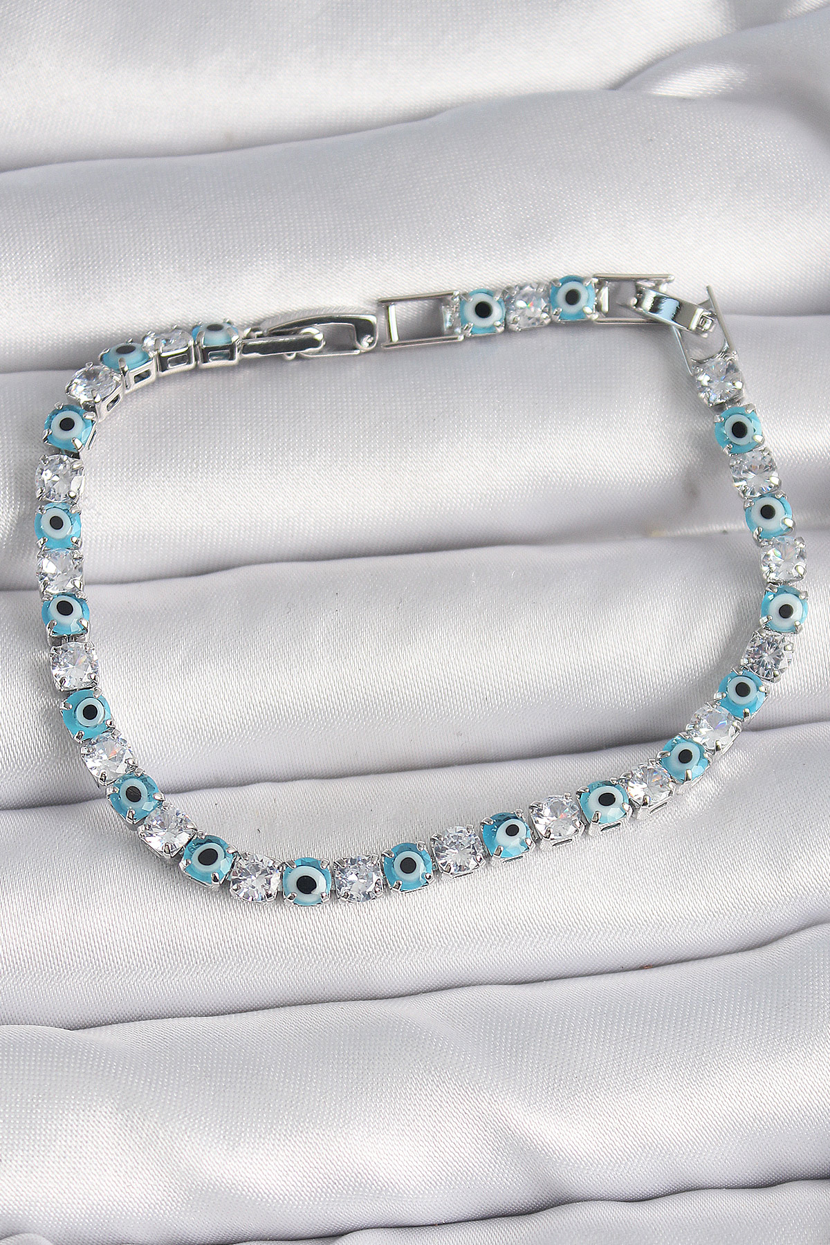 Tegan Pirinç Gümüş Renk Su Yolu Zirkon Taşlı Nazar Boncuklu Kadın Bileklik TG27BB6647