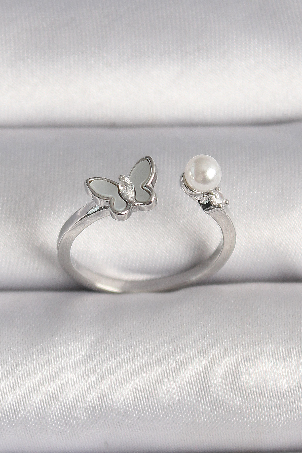 Tegan Pirinç Gümüş Renk Zirkon Taş Detaylı Beyaz Mineli Kelebek Figür İnci Detay Ayarlanabilir Yüzük TG27BYK3524