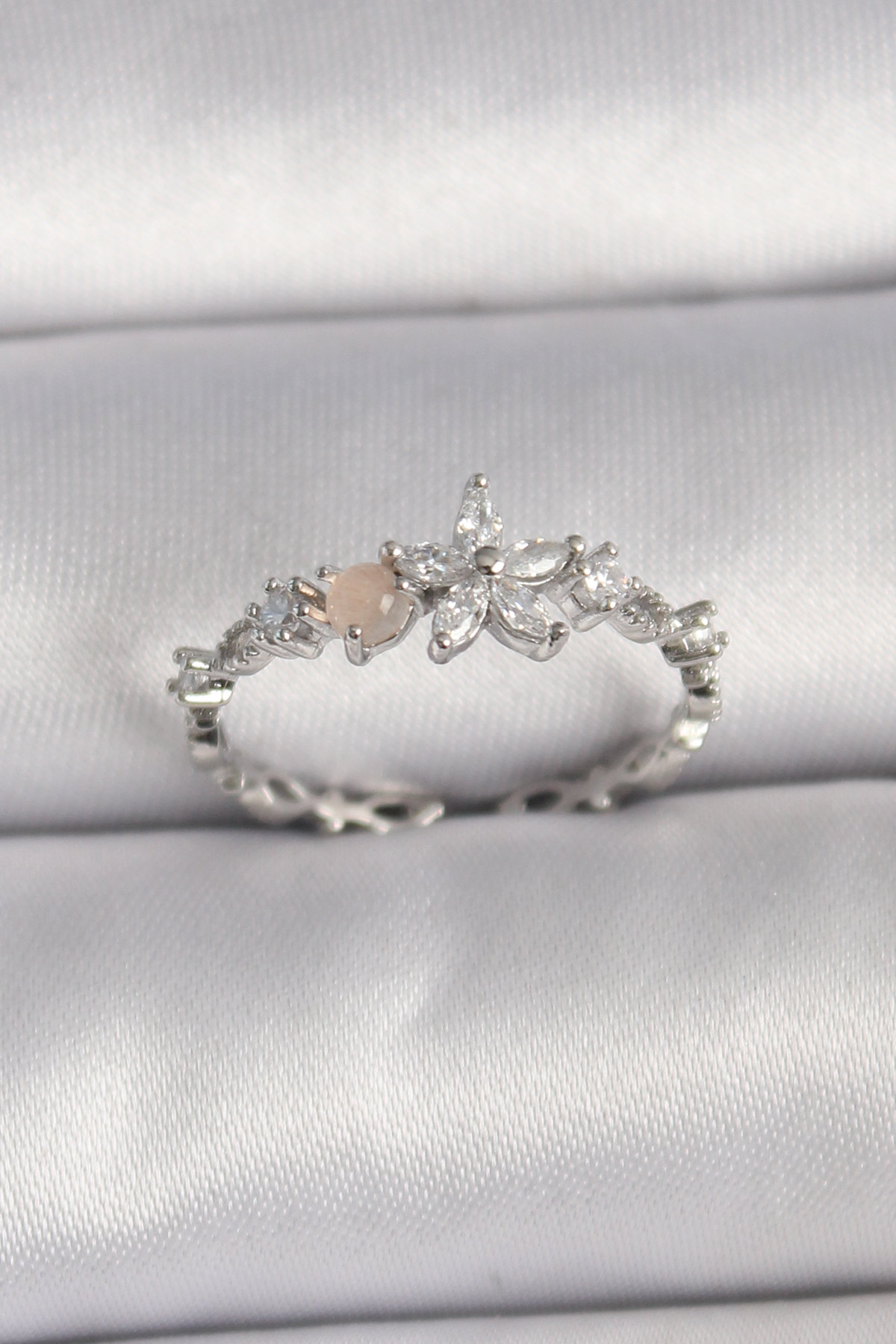 Tegan Pirinç Gümüş Renk Zirkon Taşlı Çiçek Model Ayarlanabilir Yüzük TG27BYK3564