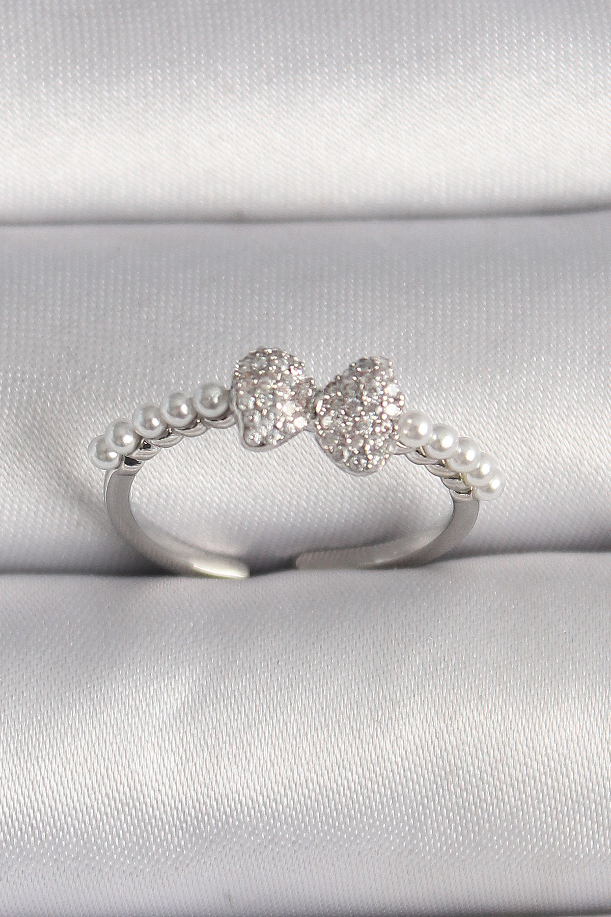 Tegan Pirinç Gümüş Renk Zirkon Taşlı Fiyonk İnci Detay Ayarlanabilir Yüzük TG27BYK3526