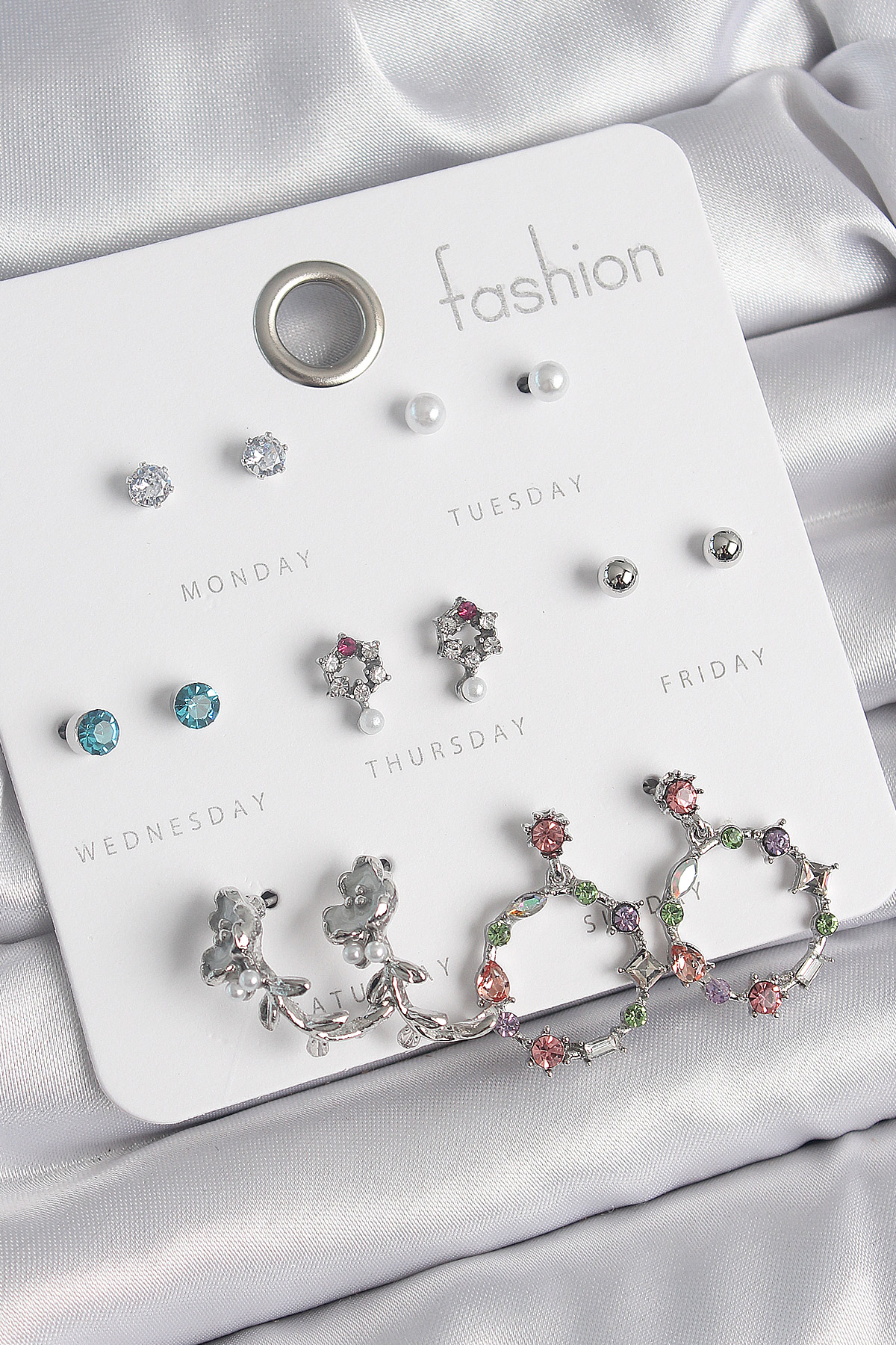 Tegan Pirinç Gümüş Renk Zirkon Taşlı Gül Figür Halka Model 7 Çift Kadın Küpe Seti TG27BKP10544