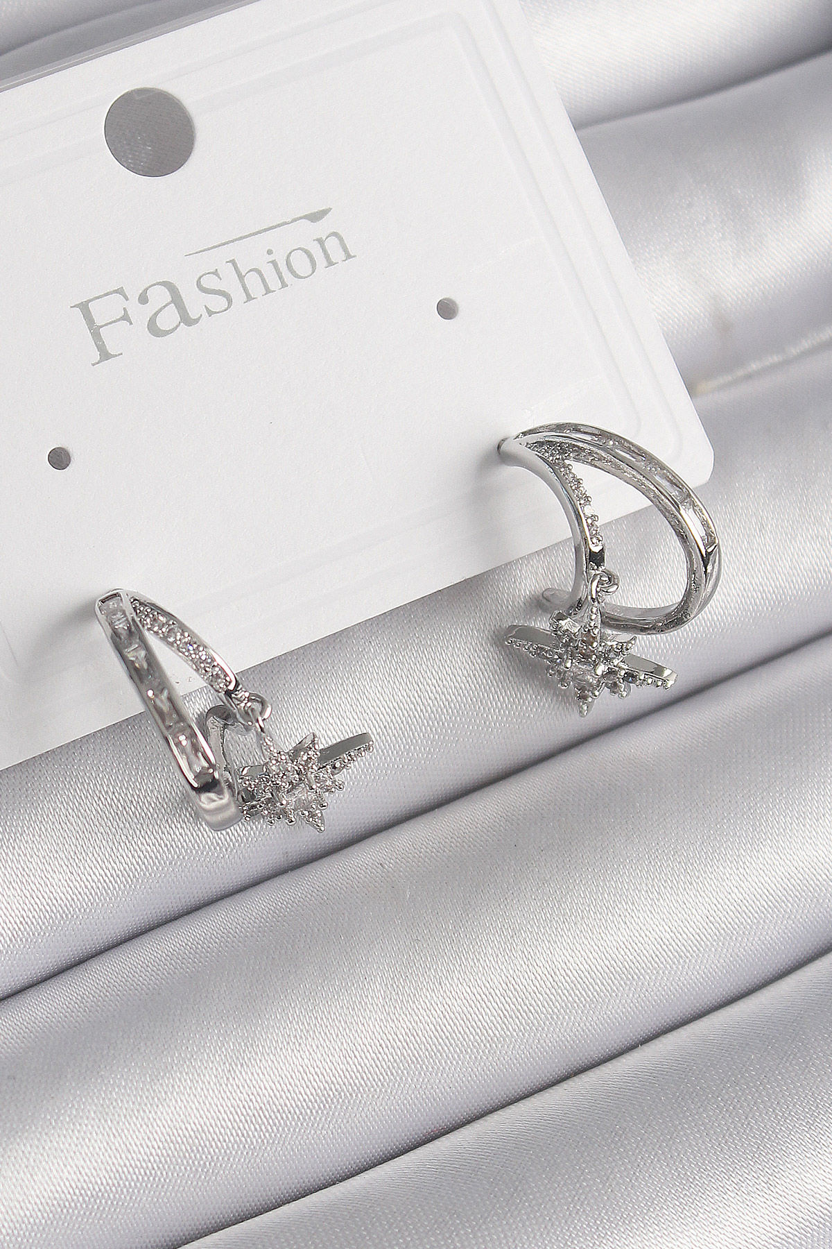 Tegan Pirinç Gümüş Renk Zirkon Taşlı Halka Model Sallantı Yıldız Detay Kadın Küpe TG27BKP9990
