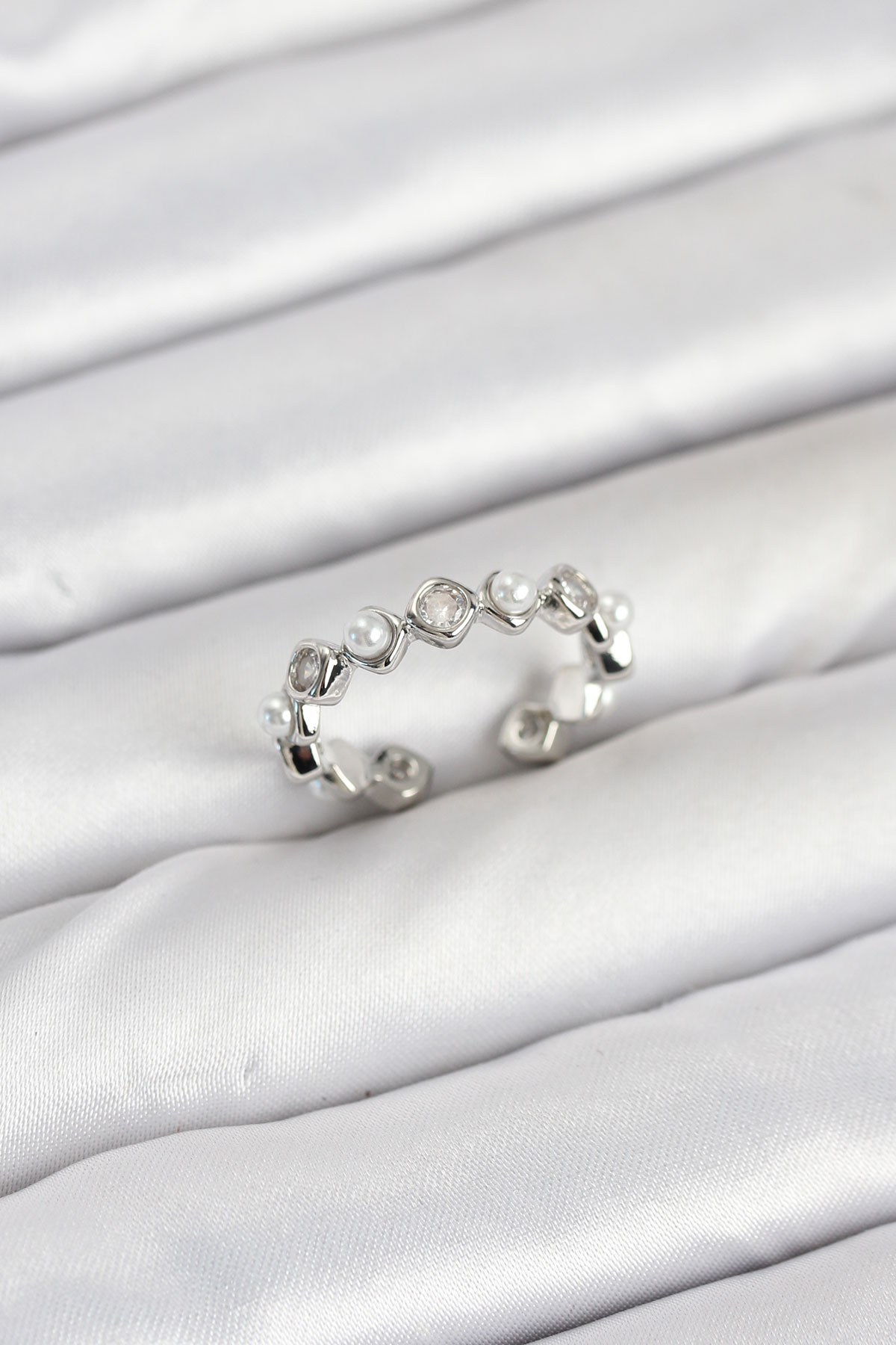 Tegan Pirinç Gümüş Renk Zirkon Taşlı İncili Kadın Yüzük TG27BYK3877