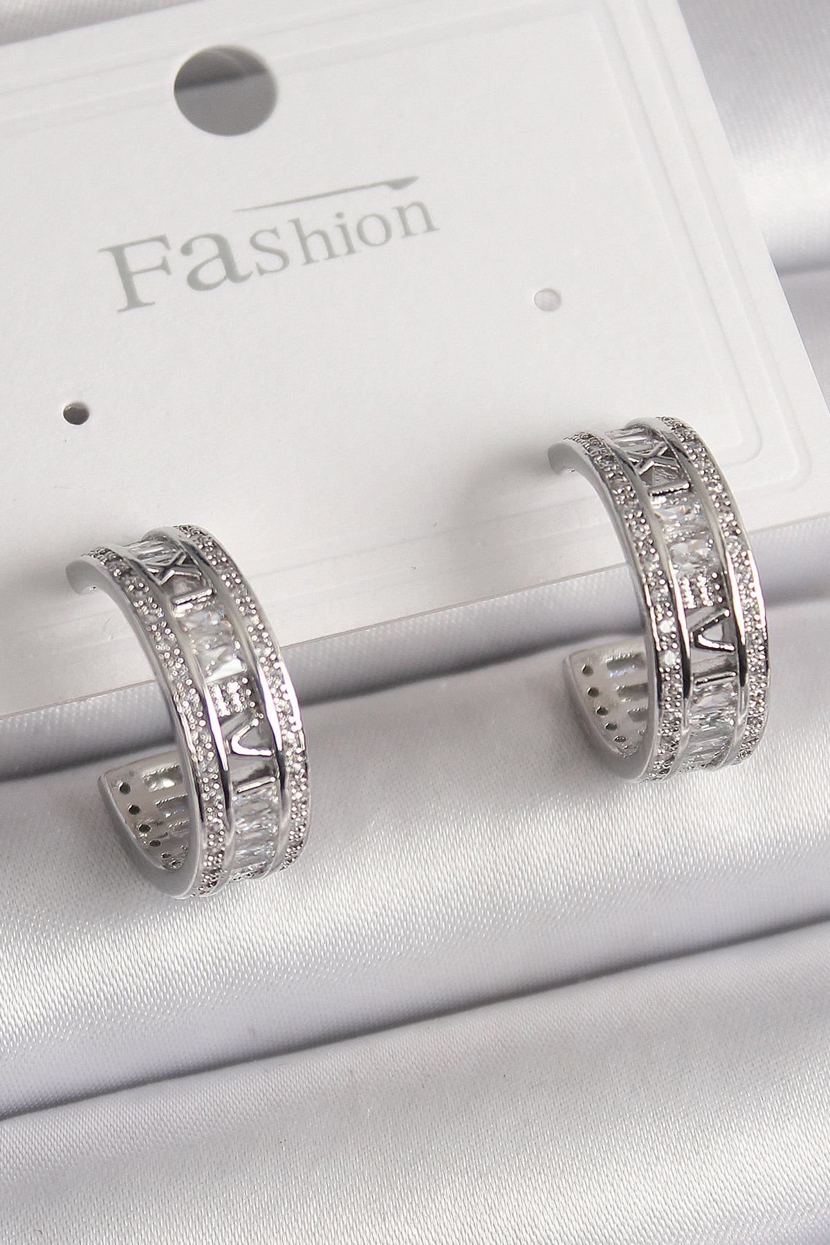 Tegan Pirinç Gümüş Renk Zirkon Taşlı İşleme Detay Halka Model Kadın Küpe TG27BKP9914