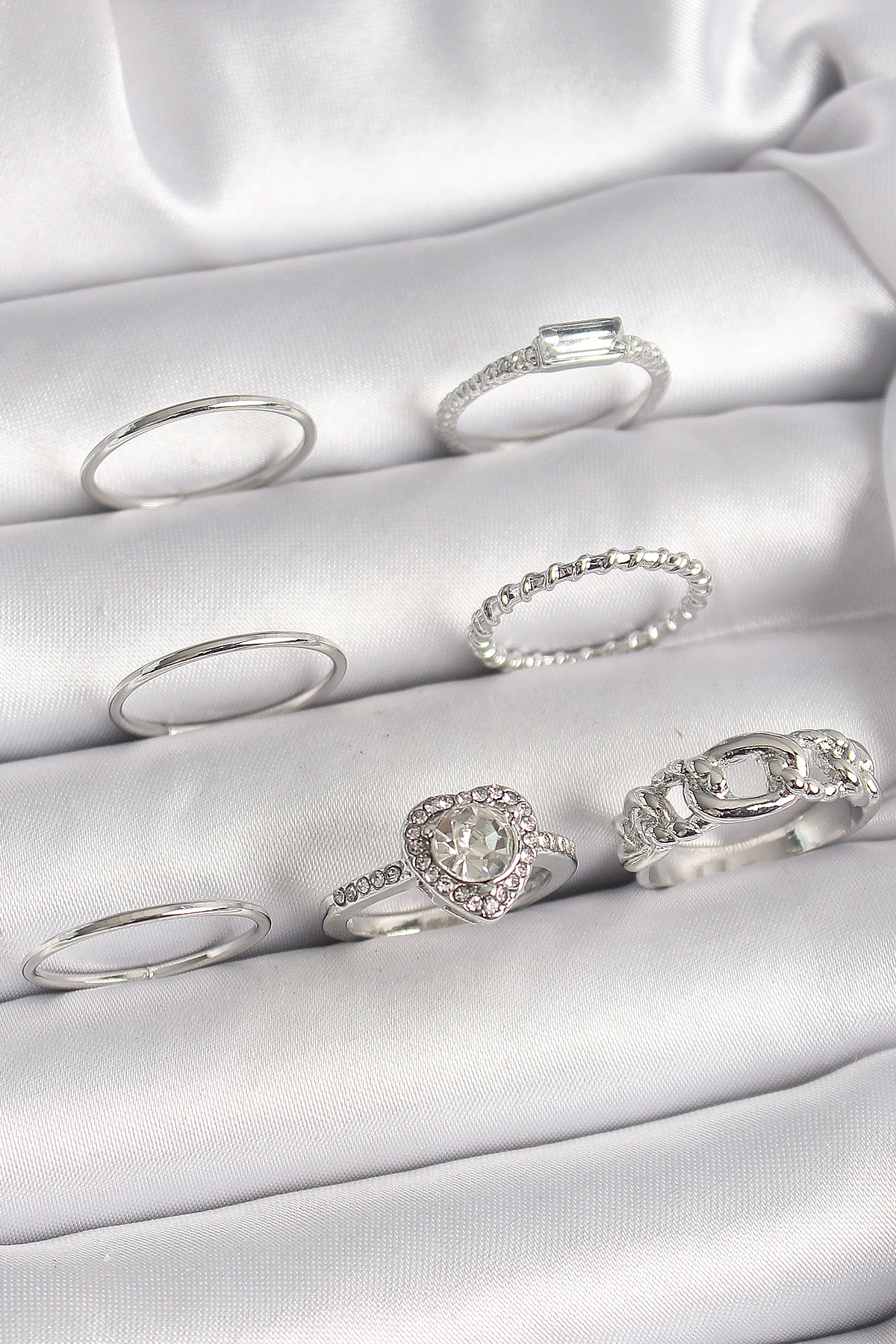 Tegan Pirinç Gümüş Renk Zirkon Taşlı Kalp Model Kadın Yüzük Kombini TG27BYK3661