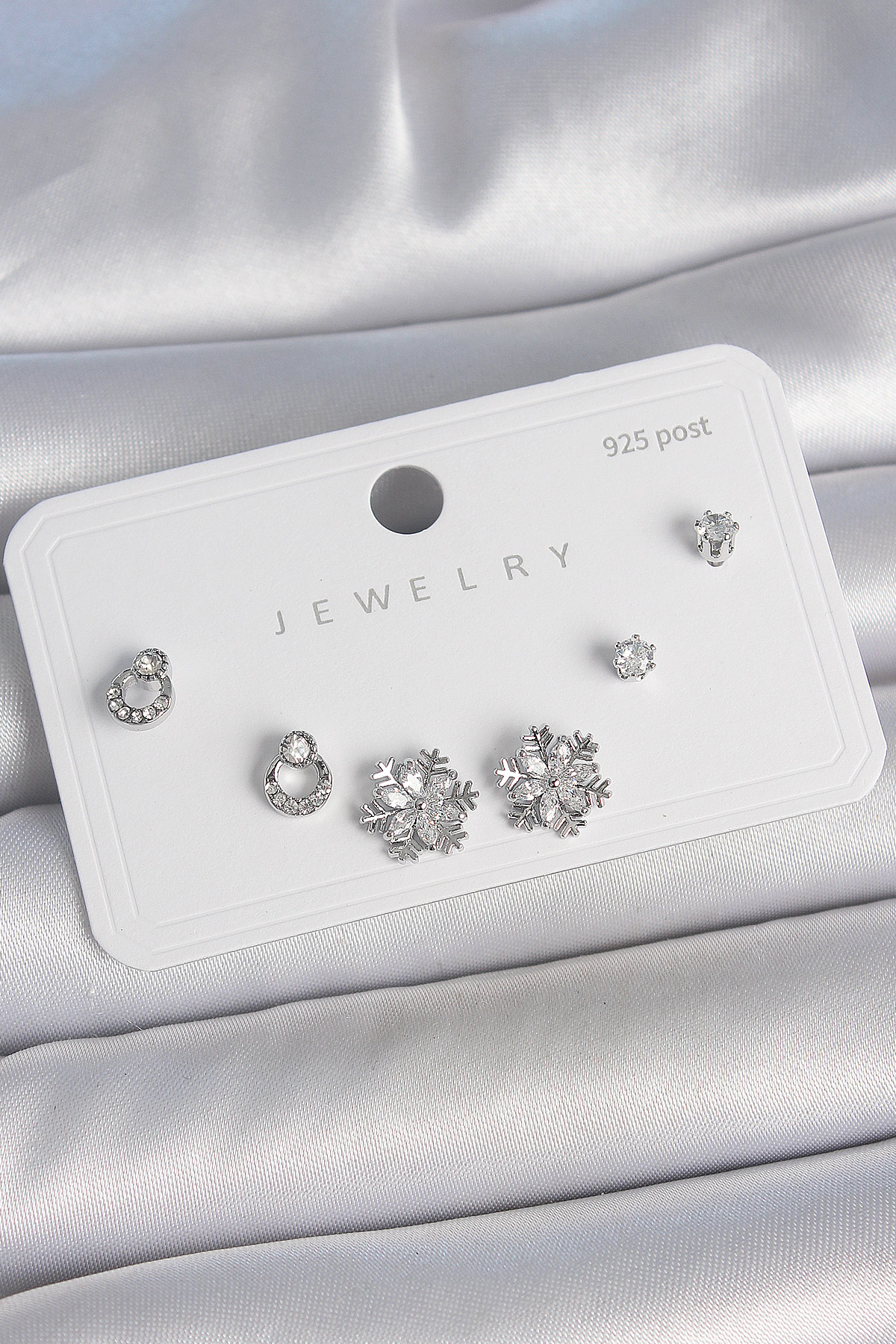 Tegan Pirinç Gümüş Renk Zirkon Taşlı Kar Tanesi Model 925 Ayar Gümüş Çivi Kadın Küpe Seti TG27BKP10483