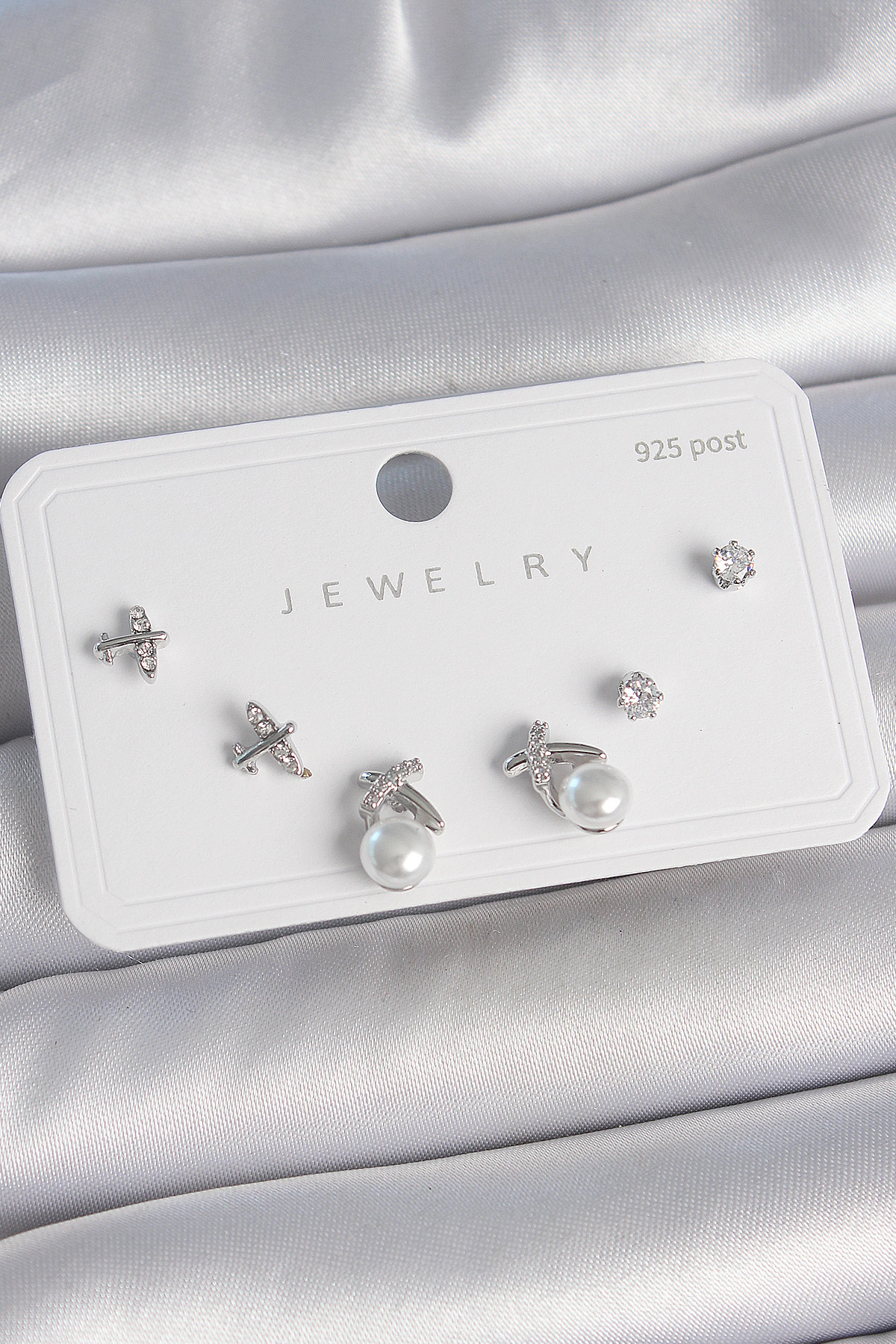 Tegan Pirinç Gümüş Renk Zirkon Taşlı Kelebek Model İnci Detay 925 Ayar Gümüş Çivi Kadın Küpe Seti TG27BKP10479