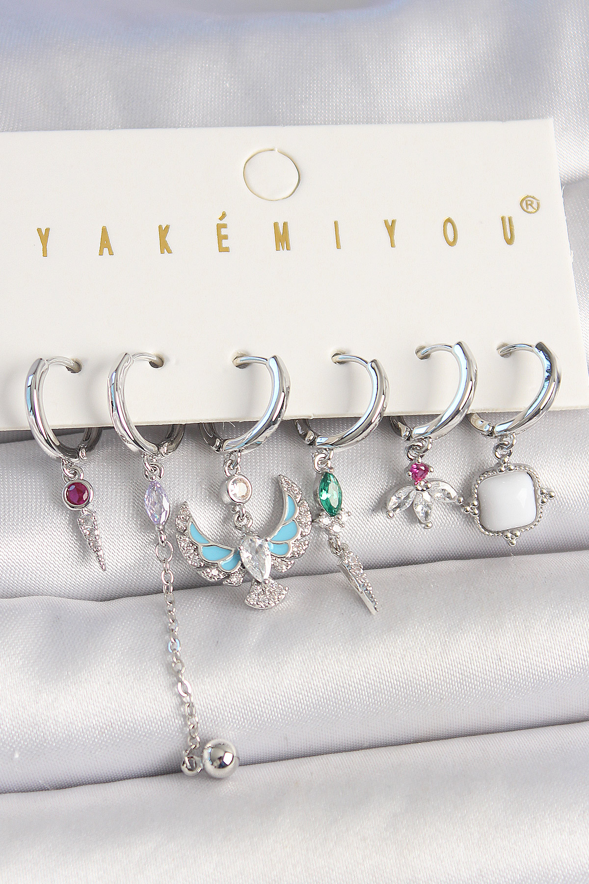 Tegan Pirinç Gümüş Renk Zirkon Taşlı Kuş Figür Çiçek Detay 6’Lı Kadın Kombin Küpe TG27BKP10454