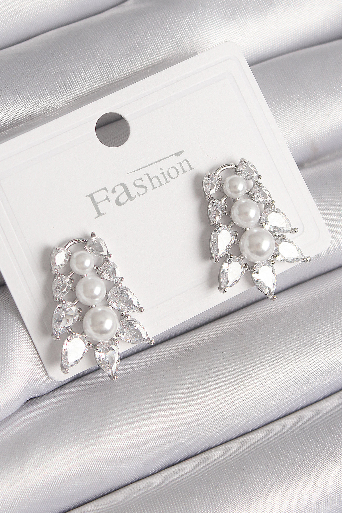 Tegan Pirinç Gümüş Renk Zirkon Taşlı Yaprak Model İnci Detay Kadın Küpe TG27BKP9799