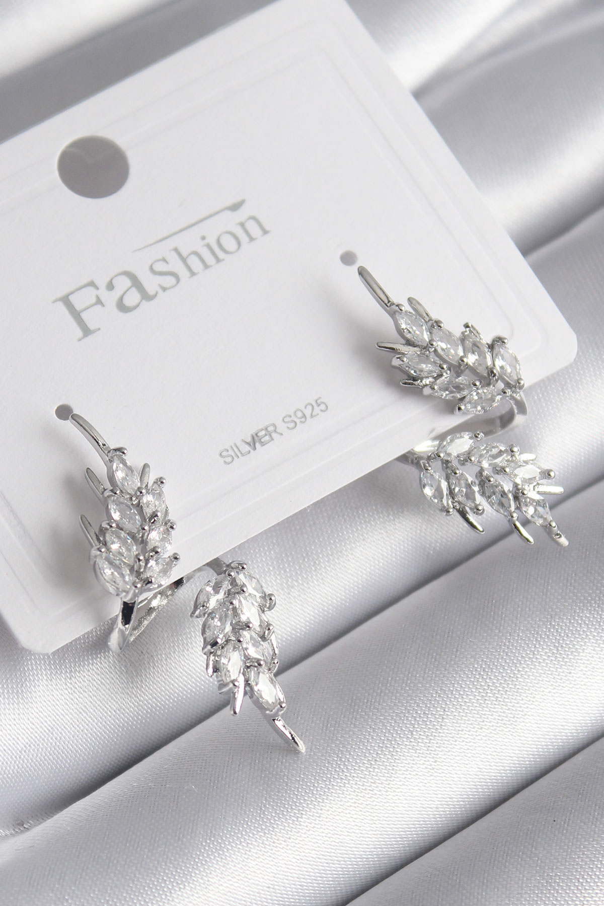 Tegan Pirinç Gümüş Renk Zirkon Taşlı Yaprak Model Kadın Küpe TG27BKP9946