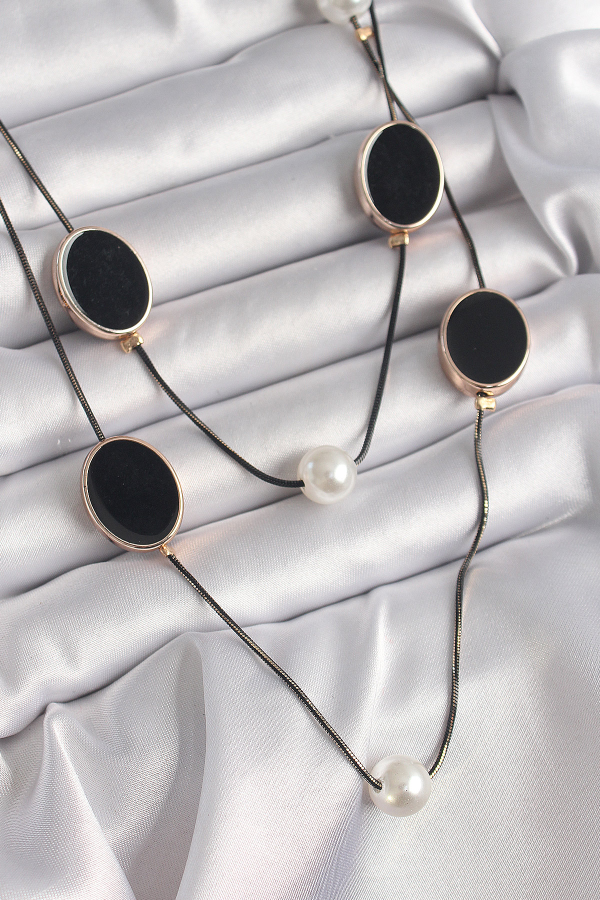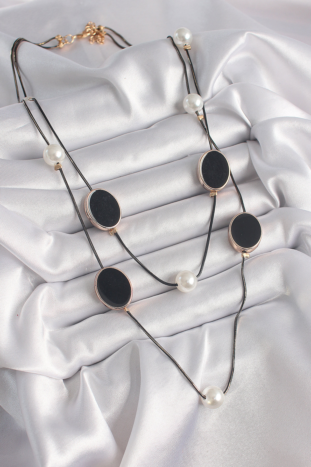 Tegan Pirinç Siyah Renk Zincir İnci Detaylı Çoklu Kadın Kolye TG27BKO9621
