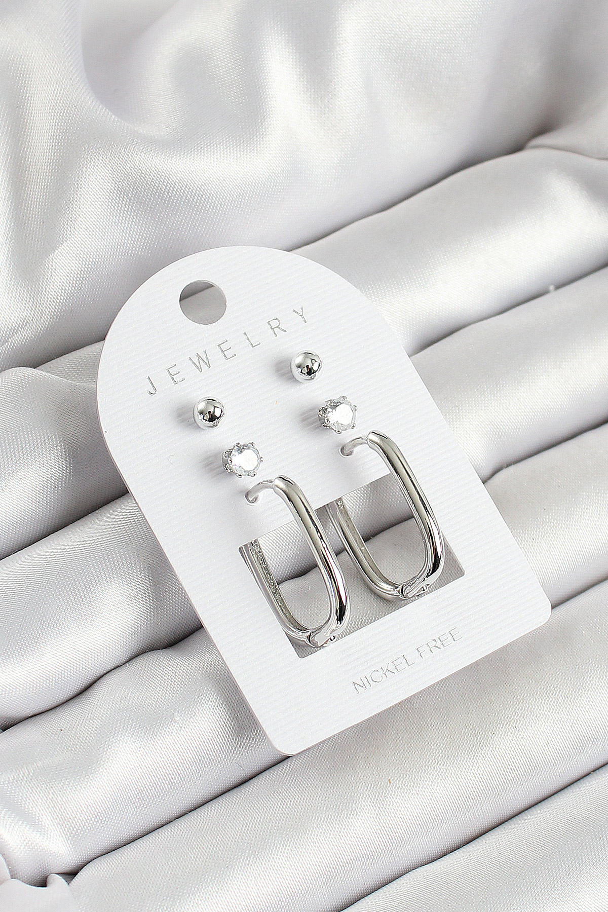 Tegan Pirinç Zirkon Taş Ve Dikdörtgen Figürlü Gümüş Renk 3’lü Çift Kadın Küpe Set TG27BKP10645