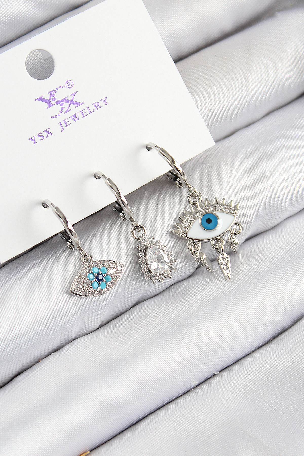 Tegan Pirinç Zirkon Taşlı 3’lü Fatma’nın Gözü Model Gümüş Renk Kadın Küpe TG27BKP11130