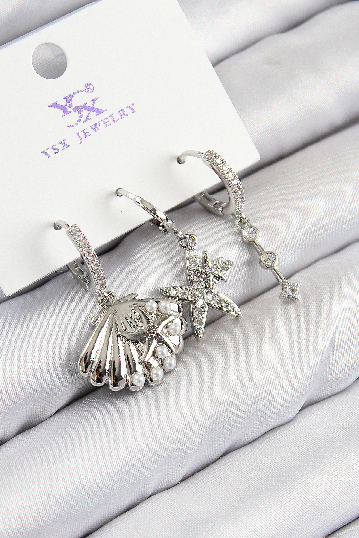 Tegan Pirinç Zirkon Taşlı 3’lü Yıldız Ve İstiridye Model Gümüş Renk Kadın Küpe TG27BKP11131