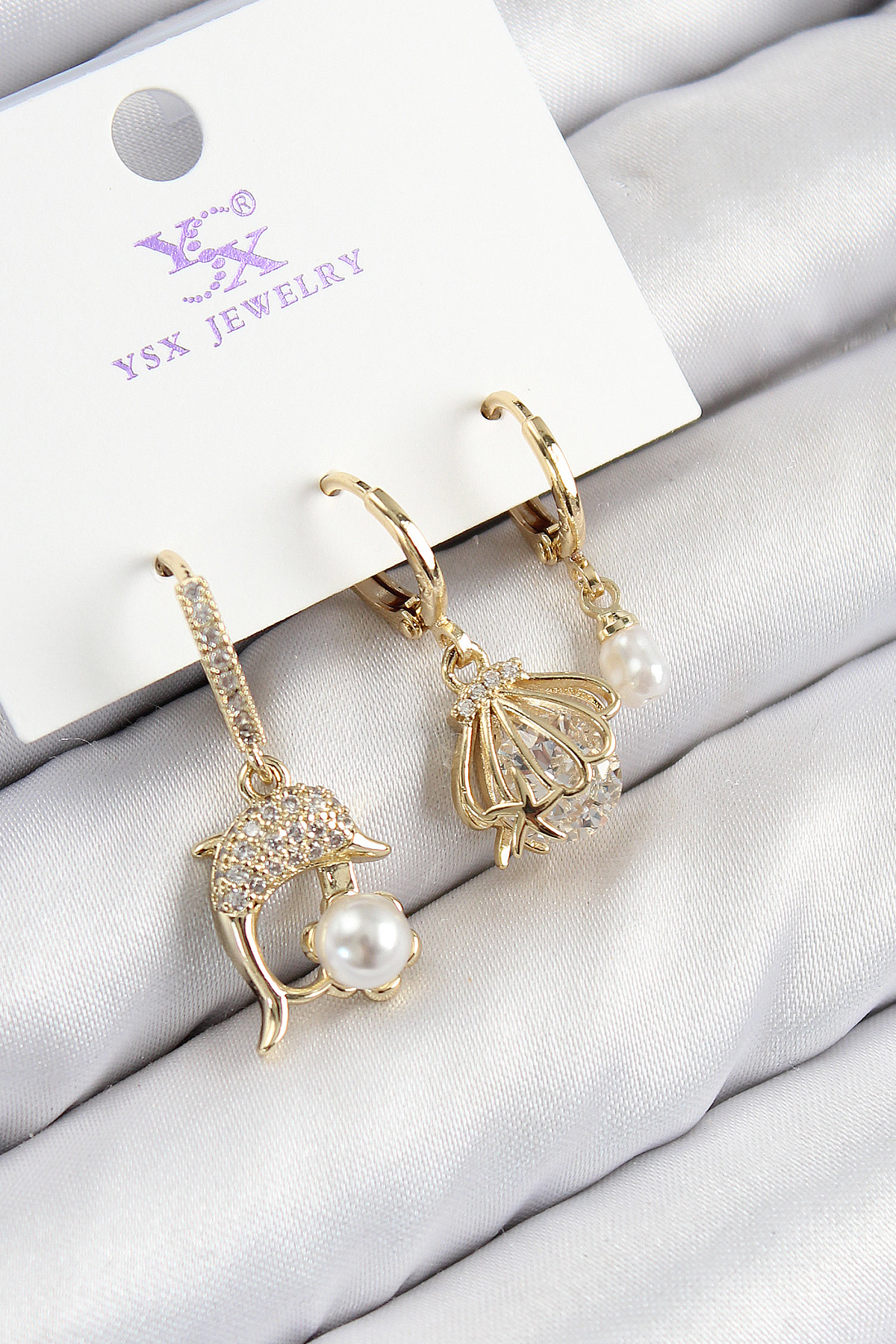 Tegan Pirinç Zirkon Taşlı 3’lü Yunus Balığı Ve İstiridye Model Gold Renk Kadın Küpe TG27BKP11139