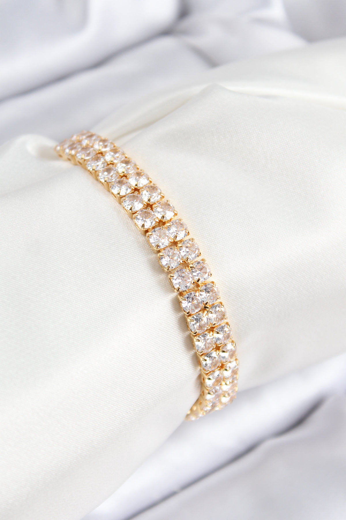 Tegan Pirinç Zirkon Taşlı Çift Sıra Kare Model Gold Renk Asansörlü Kadın Bileklik TG27BB7731