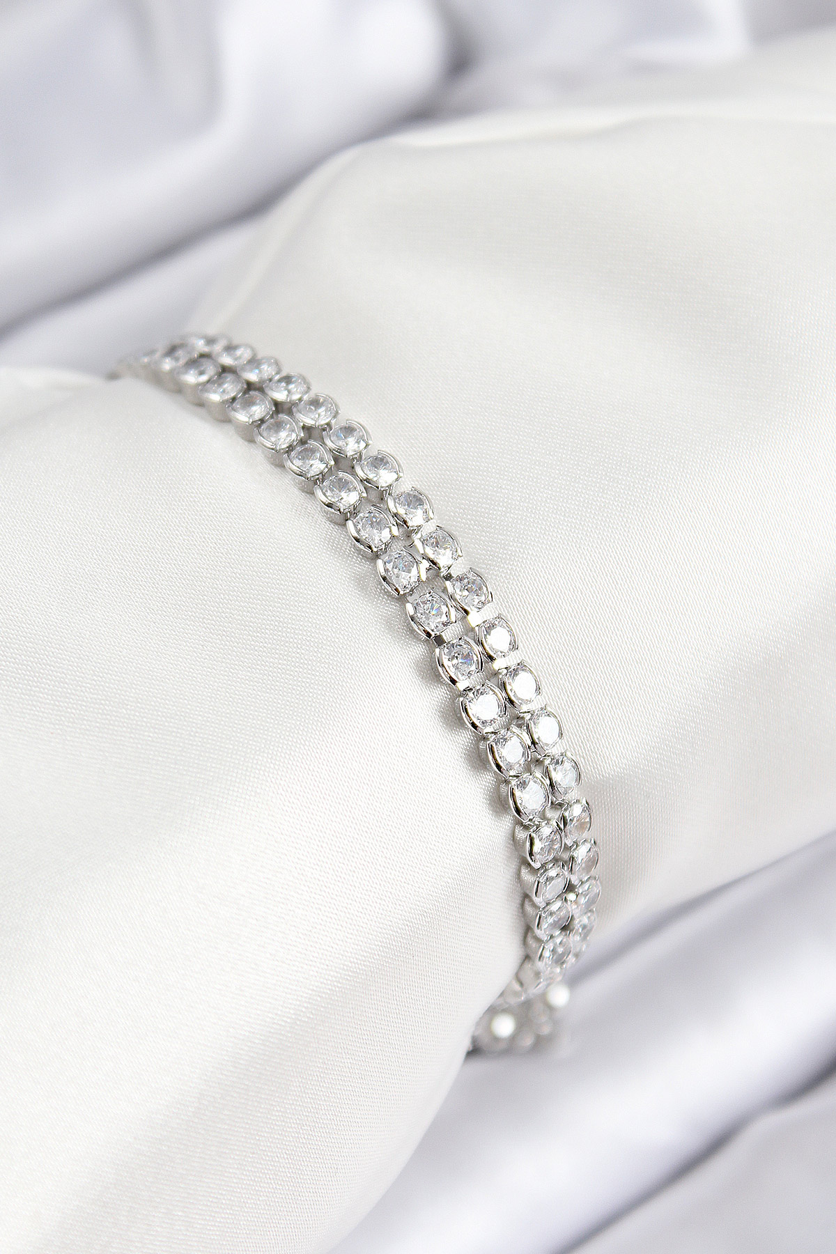 Tegan Pirinç Zirkon Taşlı Çift Sıra Model Gümüş Renk Asansörlü Kadın Bileklik TG27BB7738