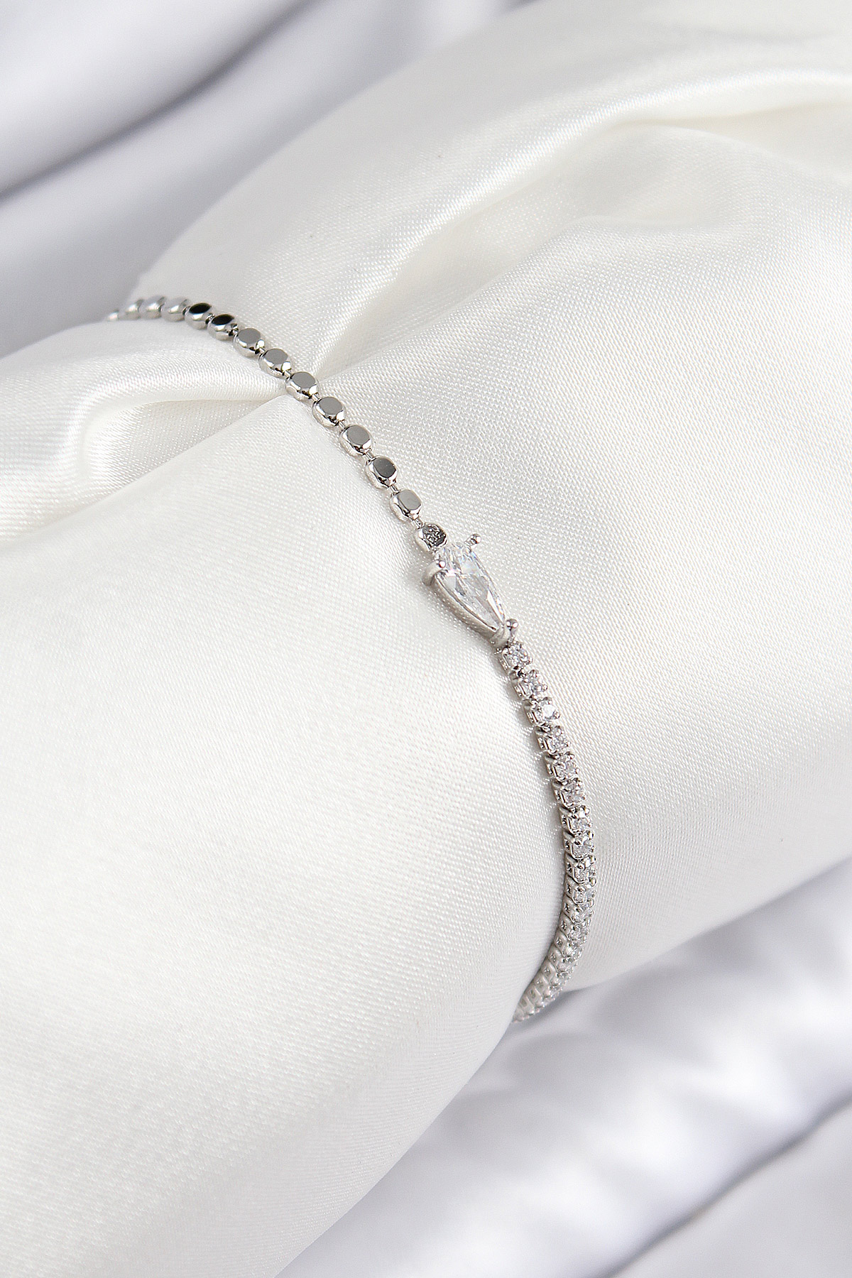 Tegan Pirinç Zirkon Taşlı Damla Model Ezme Zincir Gümüş Renk Kadın Bileklik TG27BB7590