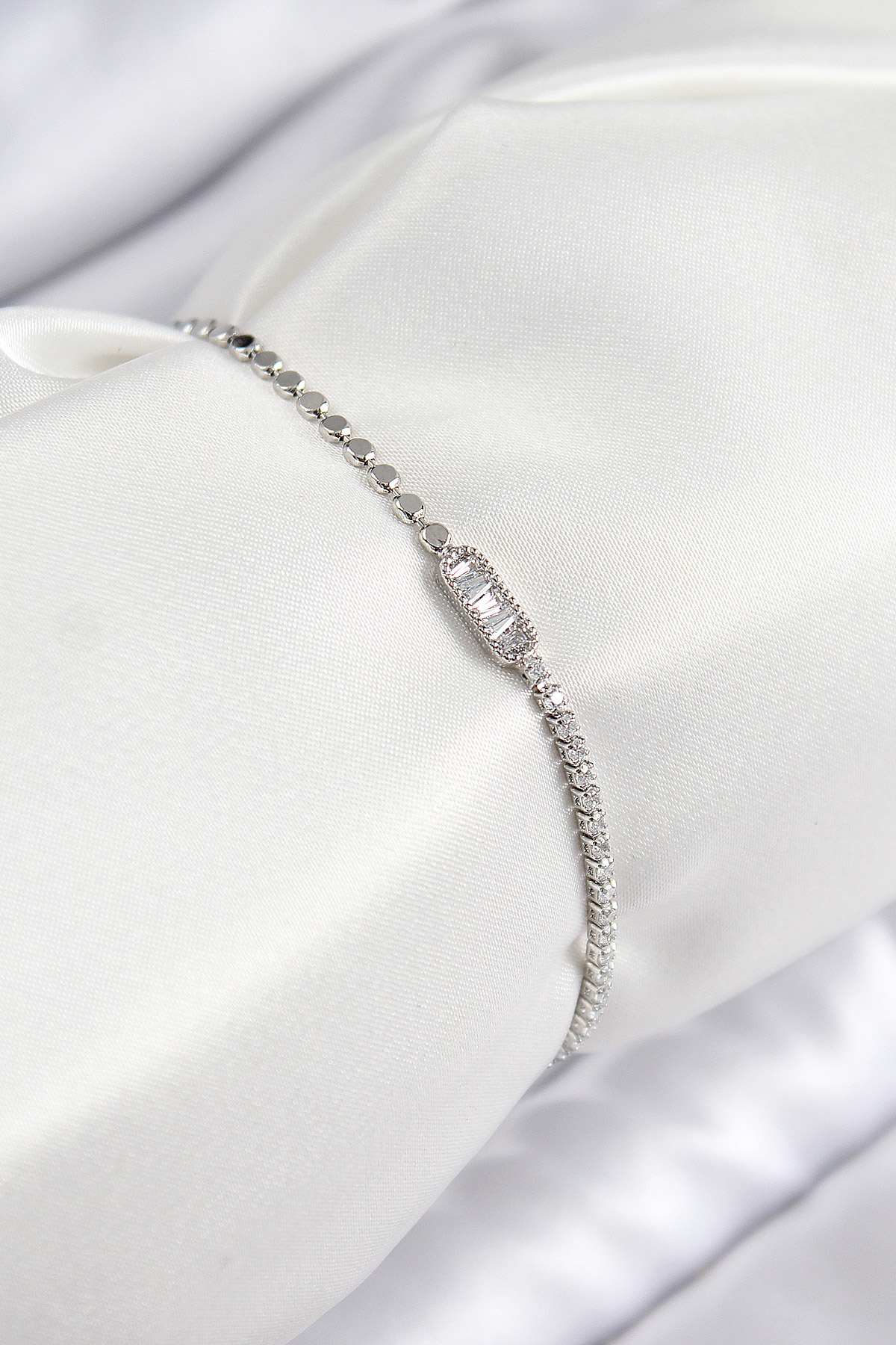 Tegan Pirinç Zirkon Taşlı Dikdörtgen Model Ezme Zincir Gümüş Renk Kadın Bileklik TG27BB7594