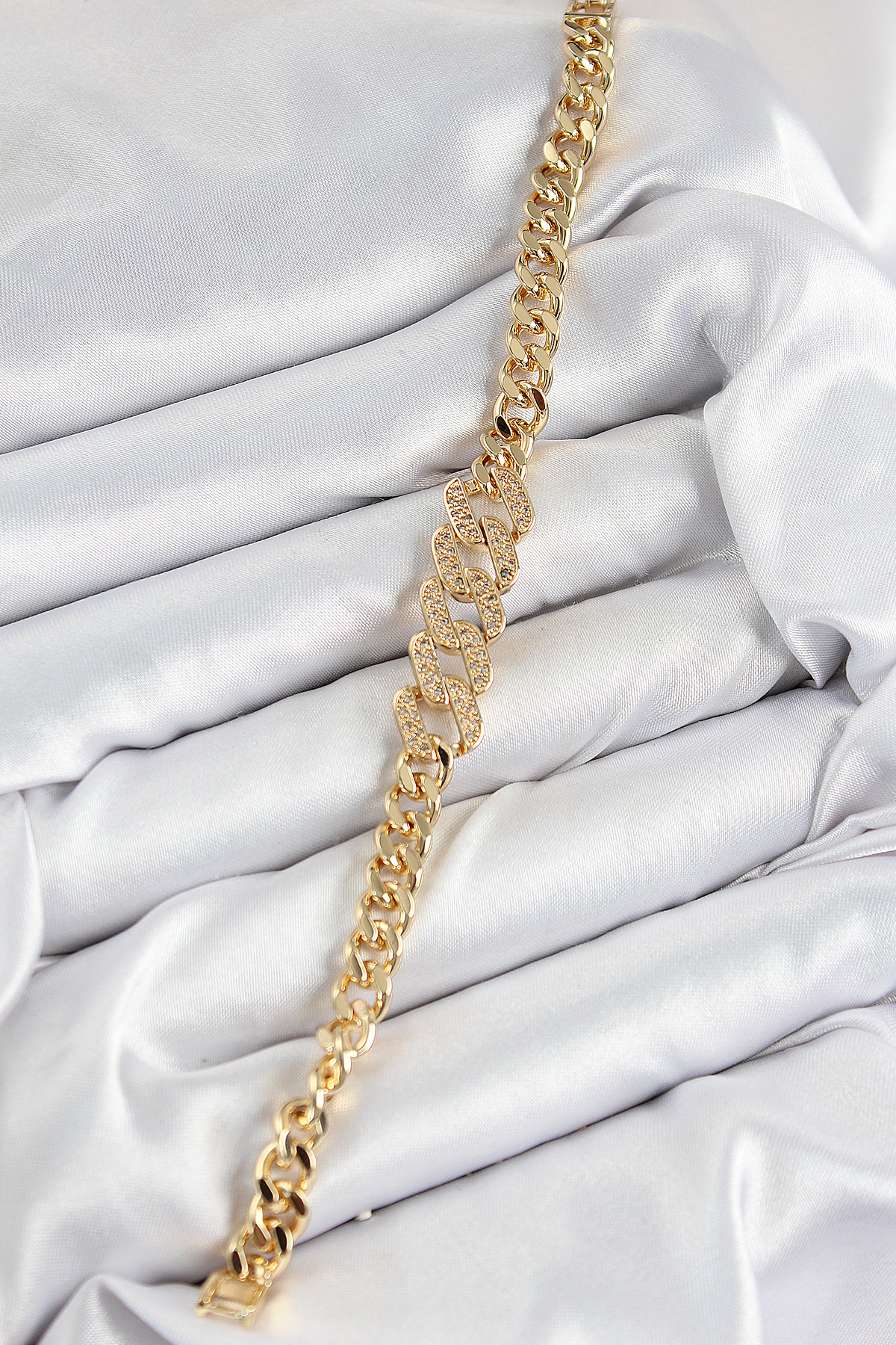 Tegan Pirinç Zirkon Taşlı Ezme Küba Zincir Model Gold Renk Kadın Bileklik TG27BB7549