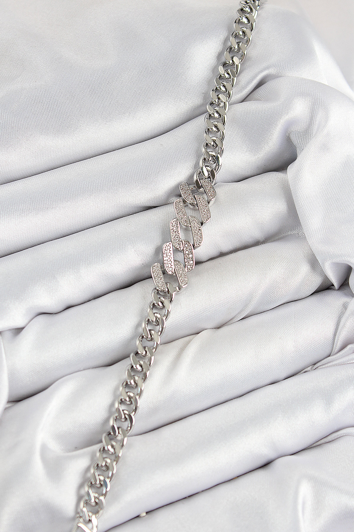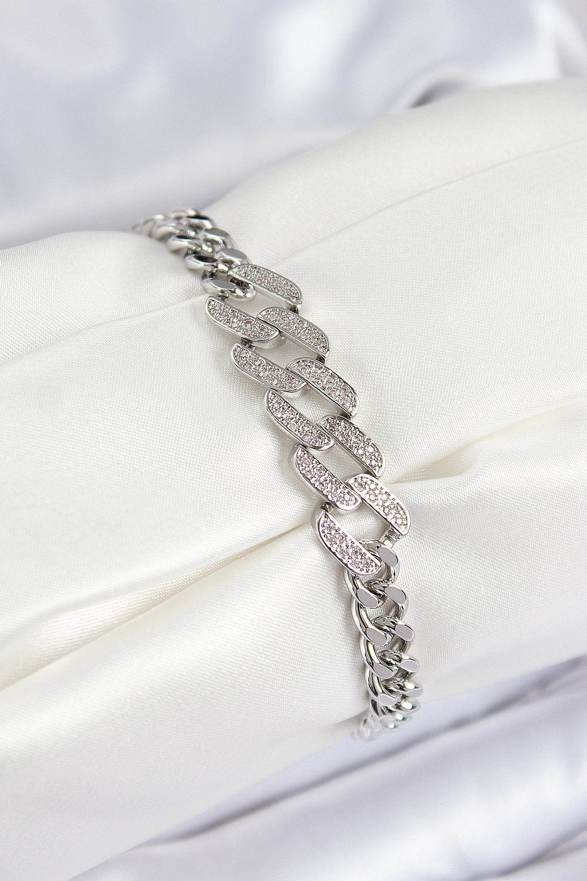 Tegan Pirinç Zirkon Taşlı Ezme Küba Zincir Model Gümüş Renk Kadın Bileklik TG27BB7550