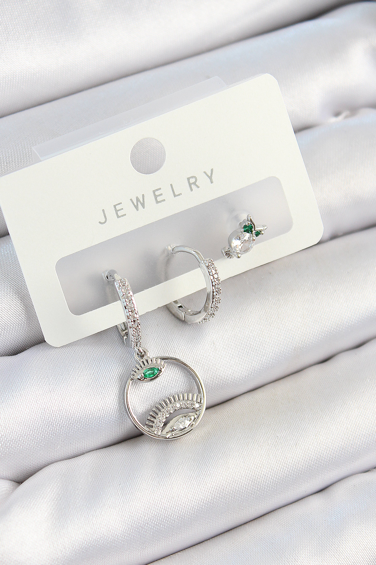 Tegan Pirinç Zirkon Taşlı Göz Ve Baykuş Model Gümüş Renk 3’lü Çift Kadın Küpe Set TG27BKP10795